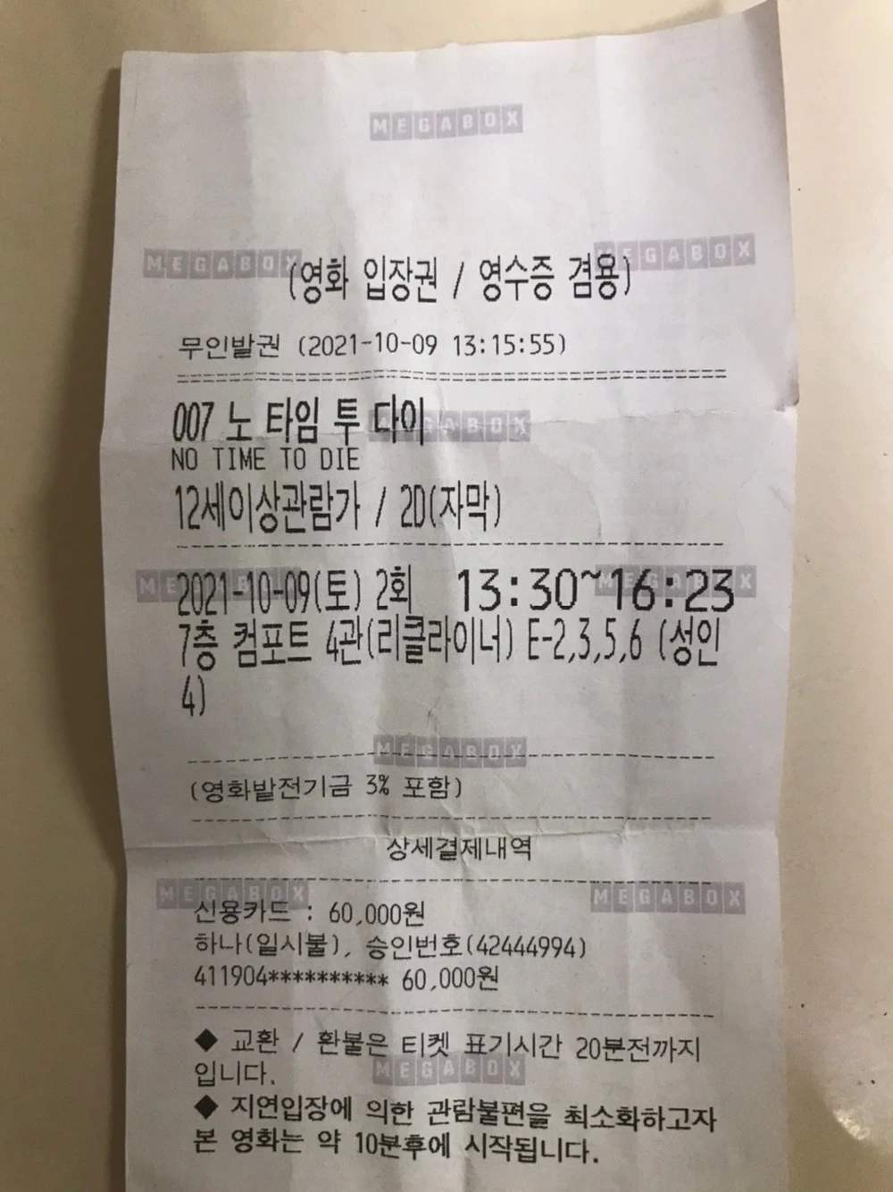블로그에 영화 후기를 적을 생각을 미리 했으면 사진을 많이 찍었을 터인데, 당시에는 별생각도 없고 사진도 잘 찍는 편이 아니라 입장권 하나만 달랑 남았다. 현장에서 바로 티켓을 사서 따로 할인도 받지 않았다. 정말 제값 다 주고 영화를 본 것이 얼마 만인지 모르겠다. 요즘은 통신사 할인은 기본이라던데 혹시 누가 갑자기 안 온다고 할까 예매를 하지 않은 내 조심성을 원망해야겠다. 심지어 리클라이너석이라서 가격이 무려 인당 15000원이 나왔다. 리클라이너석이 편하긴 했지만 이 정도 가격이라니……