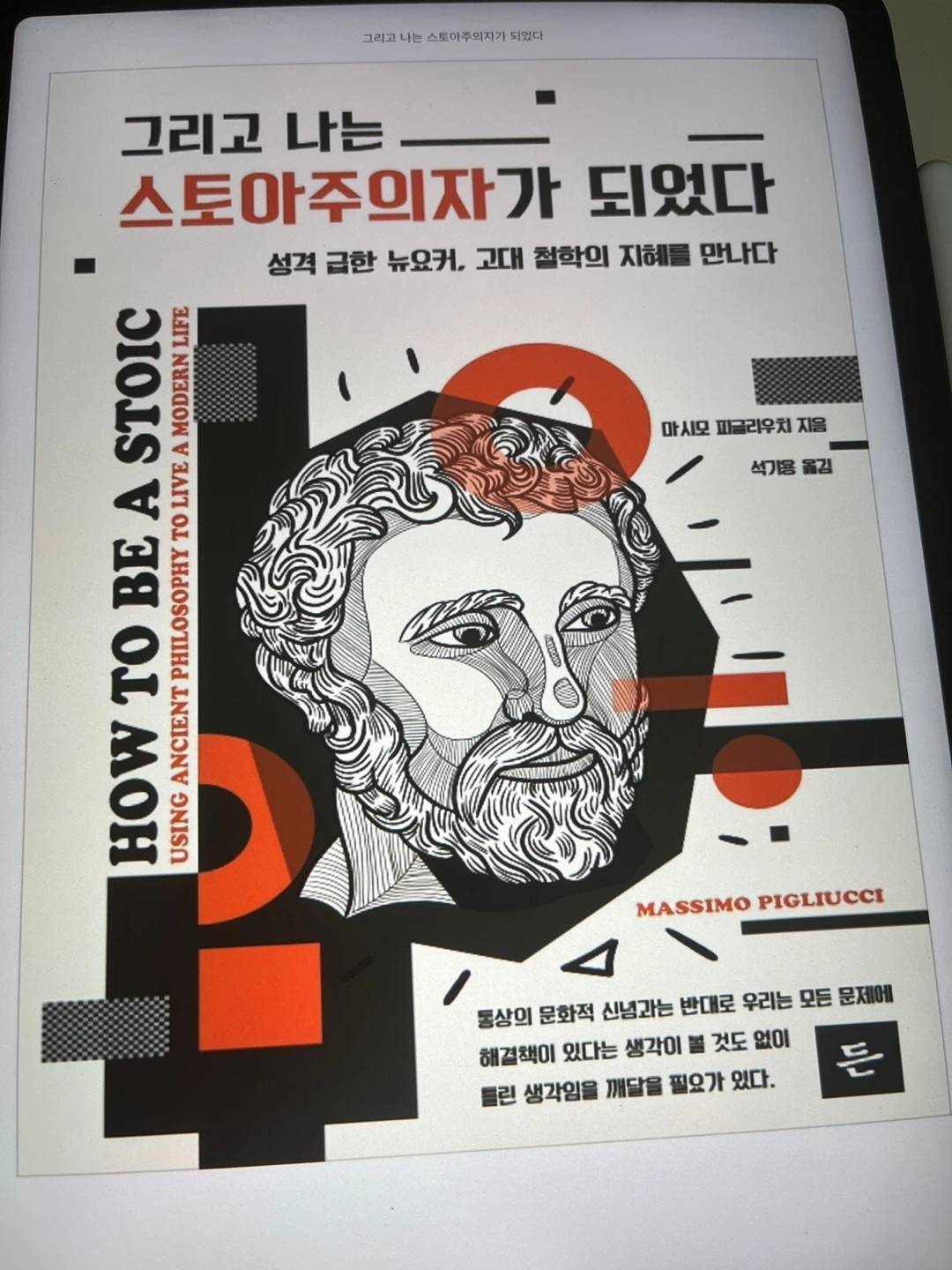 책을 소개해주는 영상에서 우연히 접하게 된 책이다. ‘명상록’을 통해 접한 스토아철학에 어느 정도 호감이 있었고 과학자가 쓴 철학책이라는 점도 흥미를 동하게 했다. 하지만 구매를 망설이는 사이 절판이 되어버렸다. 어쩔 수 없이 e-book으로 보아야 했다. 일반적인 딱딱한 철학책과는 그 궤를 달리한다. 작가의 경험을 스토아 철학과 잘 결부시켜 설명하기에 부드럽게 읽을 수 있다. 에픽테토스라는 선생을 설정하여 사고를 이어 나가는 것도 좋았다. 개인적으로 나도 그렇게 특정 인물을 머릿속에 떠올려 대화하는 형식으로 사고를 전개해 본 경험이 많아 친근감이 들었다.