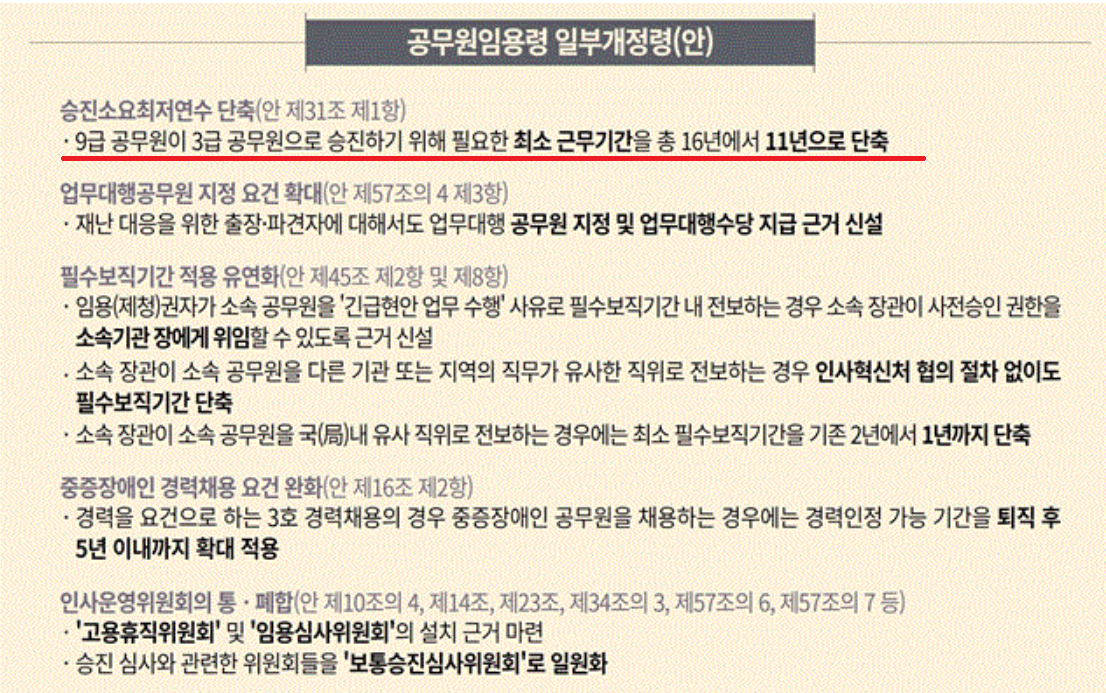 인사혁신처 공무원임용령개정안이 시행되면 공직 최말단 9급 서기보로 입직해서 11년 이상 근무하면 3급 부이사관으로 승진할 수 있는 법률적 근거가 마련되는 것으로 인사행정에서 획기적 조치라 할 수 있다. 물론 공무원임용령이 개정 시행되더라도 근무기간 11년을 충족하였다고 대상자 모두가 승진하는 것은 아니다. 승진을 보장하는 것이 아니라 단지 승진하기 위한 자격요건(최저승진소요년수)을 법으로 부여하는 것이다. 즉, 승진하기 위한 최소한 근무년수를 줄임으로 승진 진입장벽을 낮춘 것이다