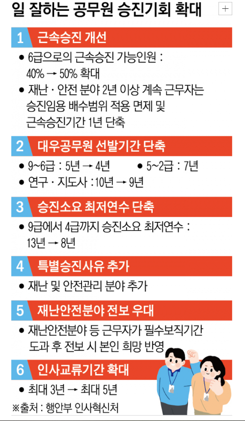 행정안전부와 인사혁신처 등 중앙정부는 현실의 상황을 무겁게 인식하고 어제 임용 5년 이하 저연차 공무원에 대한 사기진작 대책을 발표하였다. 내용을 살펴보니 승진기회 확대, 합리적 보상, 근무여건 개선 등으로 요약할 수 있다. 얼핏 보면 김영삼 정부 금융실명제 개혁만큼 혁신적 개혁안으로 보일 수 있다. 그러나 26년 차 시니어 공무원에게는 지나가는 행인들의 눈길을 끌 수 있는 백화점 쇼윈도 진열상품으로 밖에 보이지 않는다. 9급에서 4급까지 최저승진소요년수를 13년으로 단축한다는 대목이 눈길을 끈다. 공무원에게 승진은 가장 강력한 인센티브이기 때문이다. 공무원들이 보수가 작아도 30년 이상을 한 직장에서 버틸 수 있는 원동력은 언젠가 팀장, 과장, 국장, 부시장으로 승진할 수 있다는 막연한 믿음이 존재하기 때문이다.