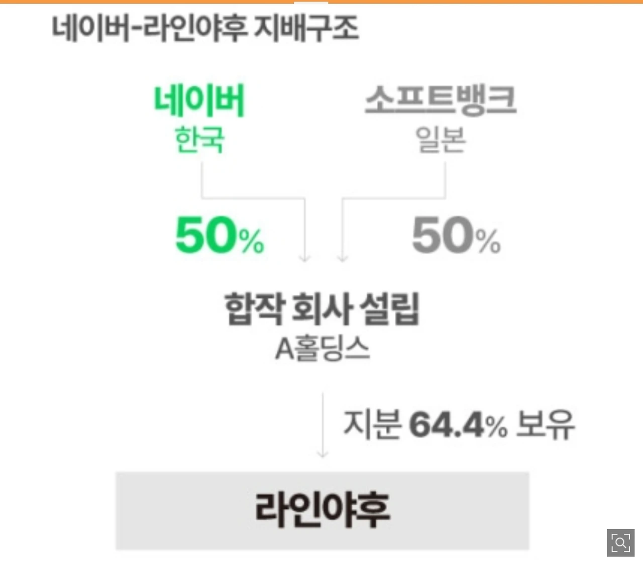 언론보도를 인용하면 2011년 네이버(NHN재팬)가 최초로 메신저 앱 '라인'을 개발하여 보급하였고, '라인'의 운영은 한국 토종기업 네이버와 일본 기업 라인야후가 각각 50%씩 공동 출자하여 'A홀딩스'라는 법인을 설립하였으며, A홀딩스가 '라인' 주식의 64%를 차지하고 있는 기업 지배구조이다. 공동출자자인 네이버는 기술개발과 클라우드 시스템을 통한 데이터 위탁관리를, 일본의 운영사인 라인야후는 라인의 홍보, 활용, 세계화 전략 등을 담당하고 있다.