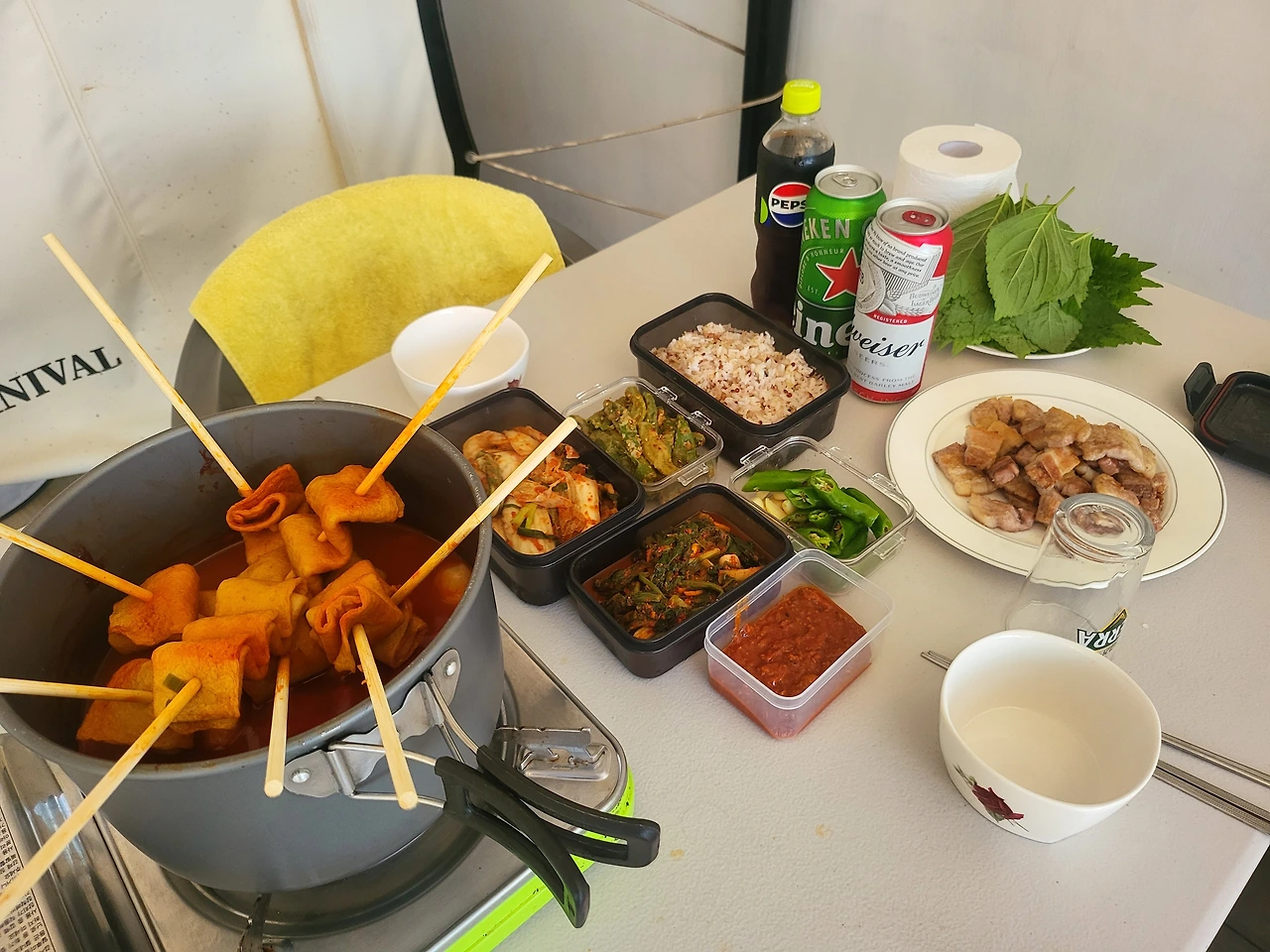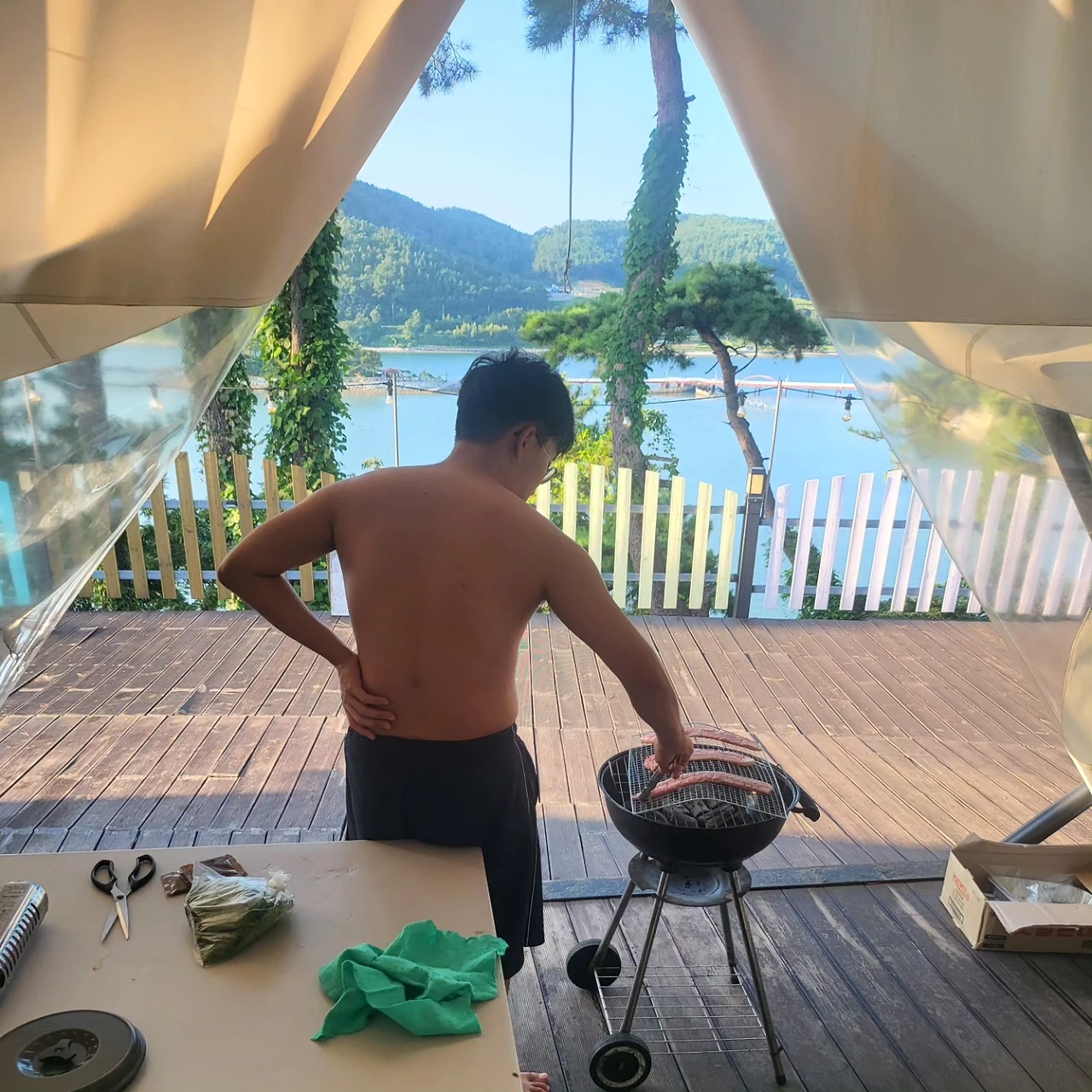 캠핑장 도착하자 집에서 아내가 챙겨 준 음식을 냉장고에 풀어놓는다. 한숨 돌리고 아들과 주변을 산책한다. 너무 더운 날씨라 오래 걷지는 못하고 저녁에 먹을 음식을 위해 인근 농협 하나로마트에 들른다. 아들과 둘이 이것저것 바구니에 담고 캠핑장으로 돌아온다. 작렬하던 태양도 뉘엿뉘엿 저물어가고 저녁시간이 되자 캠핑장 하이라이트 바비큐타임이다. 불 피우는 것을 못해 주인에게 20,000원 지불하나 고기 구워 먹을 수 있게 세팅해준다. 돈 만 있으면 편안한 여행을 즐길 수 있는 세상이다. 아들이 웃통 벗고 직접 고기를 굽기 시작한다. 처음 보는 아들의 모습이다. 어린아이 같았던 아들이 남자로 보이는 순간이었다. 이어 떡볶이 어묵탕도 끓이고 반찬을 세팅하니 제법 풍성한 만찬이다. 이 멋진 장소에서 이 좋은 음식에 사랑하는 아들과 맥주 한잔 하며 속 깊은 이야기 하고 싶은데 아들은 술을 마시지 않는다. 종교적 신념이라 아버지로서 강요할 사항은 아니다.