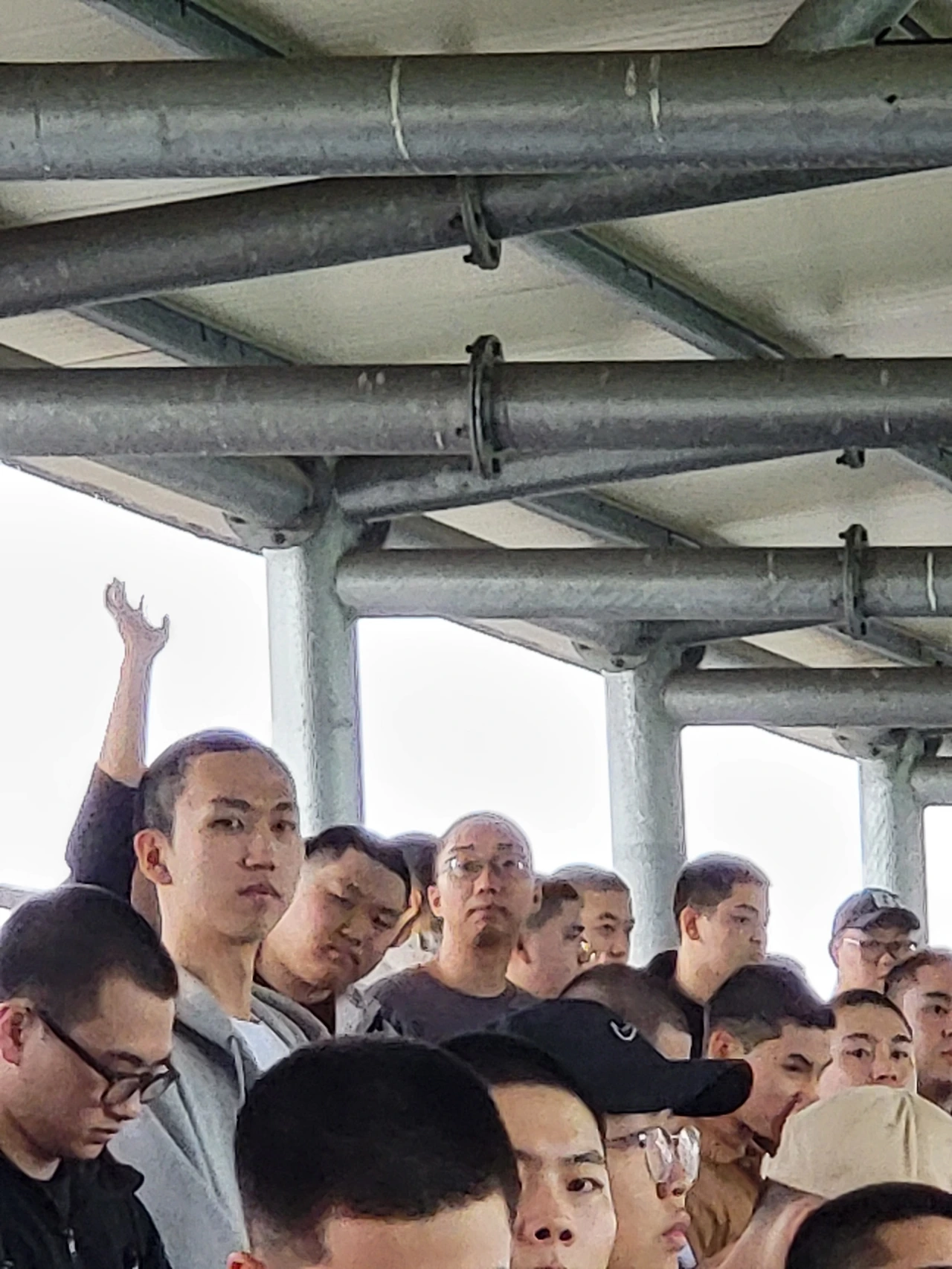 마침내 아들은 입소생들 가득한 군중 속으로 들어갔고 그 무리들 속에서 아들을 찾기는 쉽지 않았다. 짧은 머리의 건장한 남자들 속에서 아들을 눈 씻고 찾아보아도 찾을 수 없었다. 연대장의 인사가 끝나고 입소식은 그렇게 20분 만에 마무리가 되었다. "가족들은 이제 돌아가라"는 방송 멘트가 어찌나 그리 잔인하게 들리던지.. 그 순간 돌아서려고 하는데 아들이 내 눈에 포착되었다. 이때다! 핸드폰으로 찍어야겠다 싶어 카메라 배율을 높이고 숨을 멈추어서 아들 얼굴을 향해 셧터를 눌렀다. 그래 이렇게라도 보는구나! 차 안에서 핸드폰도 고치더니 아들 얼굴도 볼 수 있게 된 것이 하나님의 은혜가 아닐 수 없다. 입영심사대 문을 나서며 입소식은 마무리되었다.
