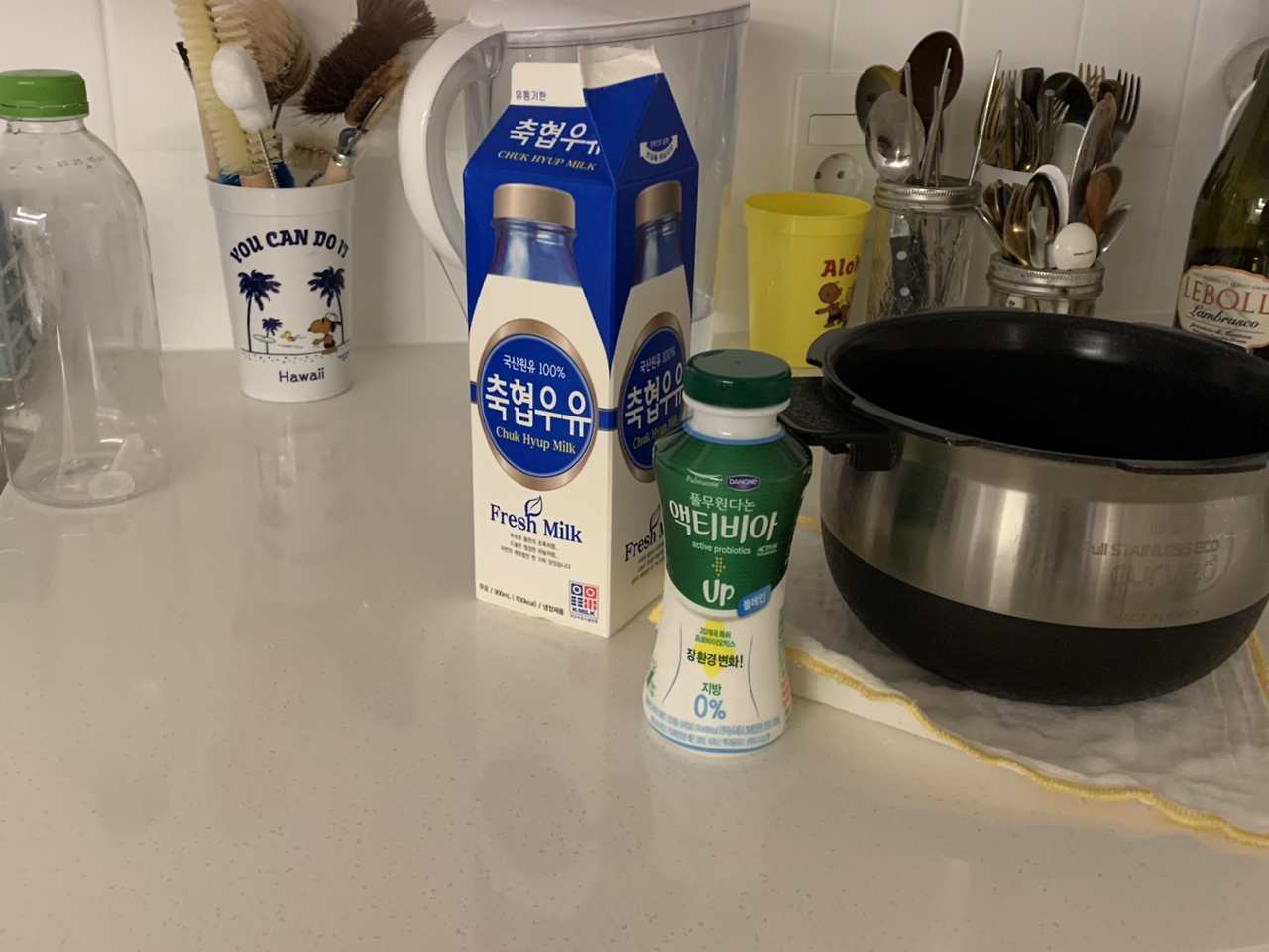 몇 달간을 그렇게 사 먹던 중 유튜브에서 우연히 밥솥으로 그릭요거트를 만드는 영상을 접했다. 보통의 그릭요거트는 100g에 3-4,000원, 500g에 12,000원 정도 하기에 좋아해서 사 먹기는 하지만 가격적인 부담감이 없는 건 아니었는데 때마침 적절한 영상이 눈에 띈 것이다. 마치 동영상 강의를 듣듯이 영상을 집중해서 보고 또 보았다. 그리고 어느 정도 자신감이 생겼을 때 준비물인 우유와 마시는 요거트를 준비했다.