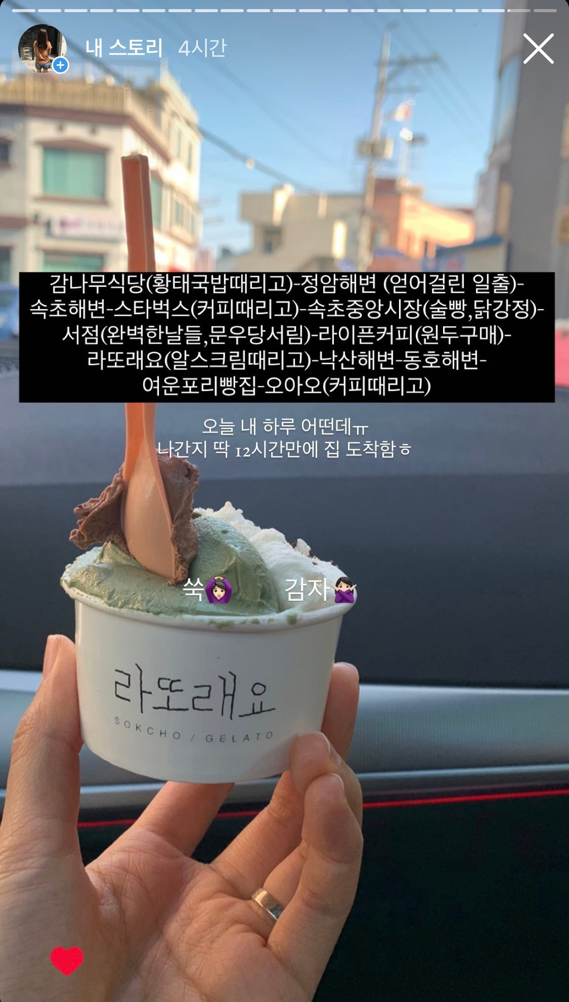 철저히 계산된 여행이 아니라 동선이 조금 뒤죽박죽 일 수는 있지만 혹여나 강원도 당일치기에 도움이 될까 싶어 인스타그램 스토리에 올린 사진으로 일정을 공유해 본다.