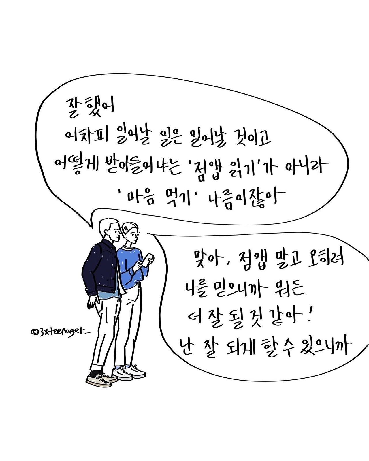 어차피 일어날 일은 일어날 것이고 어떻게 받아들이냐는 ‘점앱 읽기’가 아니라 ‘마음 먹기’ 나름이잖아. 오히려 점앱 말고 나 스스로를 믿으니까 뭐든 더 잘 될 것 같은 느낌이야.