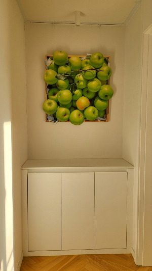 그런데 작년에 안면마비로 집에 있는 시간이 길어지면서, 매일 내가 보는 풍경의 가치를 높이고싶었다. 10만원대의 프린트물은 화질이 거칠다. 눈도 마음도 편안한 그림을 걸어두고 싶었다. 여전히 원화를 살 용기는 없었기 때문에, 유명한 작가의 고화질 프린트 액자를 사기로 마음먹고 부지런히 서울옥션과 케이옥션을 들락날락거렸다. 그러다가 발견했다. 입찰 시작가 고작 60만원에 나온, 보호필름도 떼지 않은 새 작품 컨디션의 사과 그림을.