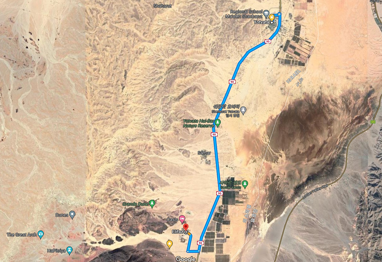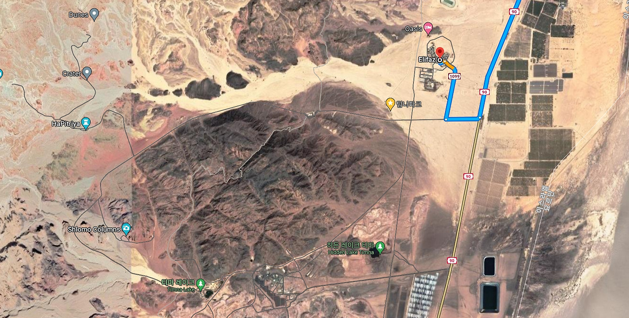 새벽 4시 50분에 집합 장소에 모인다. 인원 점검과 함께 승합차를 타고 10~15분 이동한다. 이스라엘의 수경 상추 재배법은 세계에서 유명한가 보더라. 내가 가기 얼마 전에는 우리나라 방송국에서도 촬영하러 왔다고 한다. 여러 나라에서 촬영을 하러 왔다더라. 위치는 지도에서와 같이 요트바타 키부츠에서 남쪽으로 16km 떨어진 엘리파즈(Elifaz)라는 곳이다.