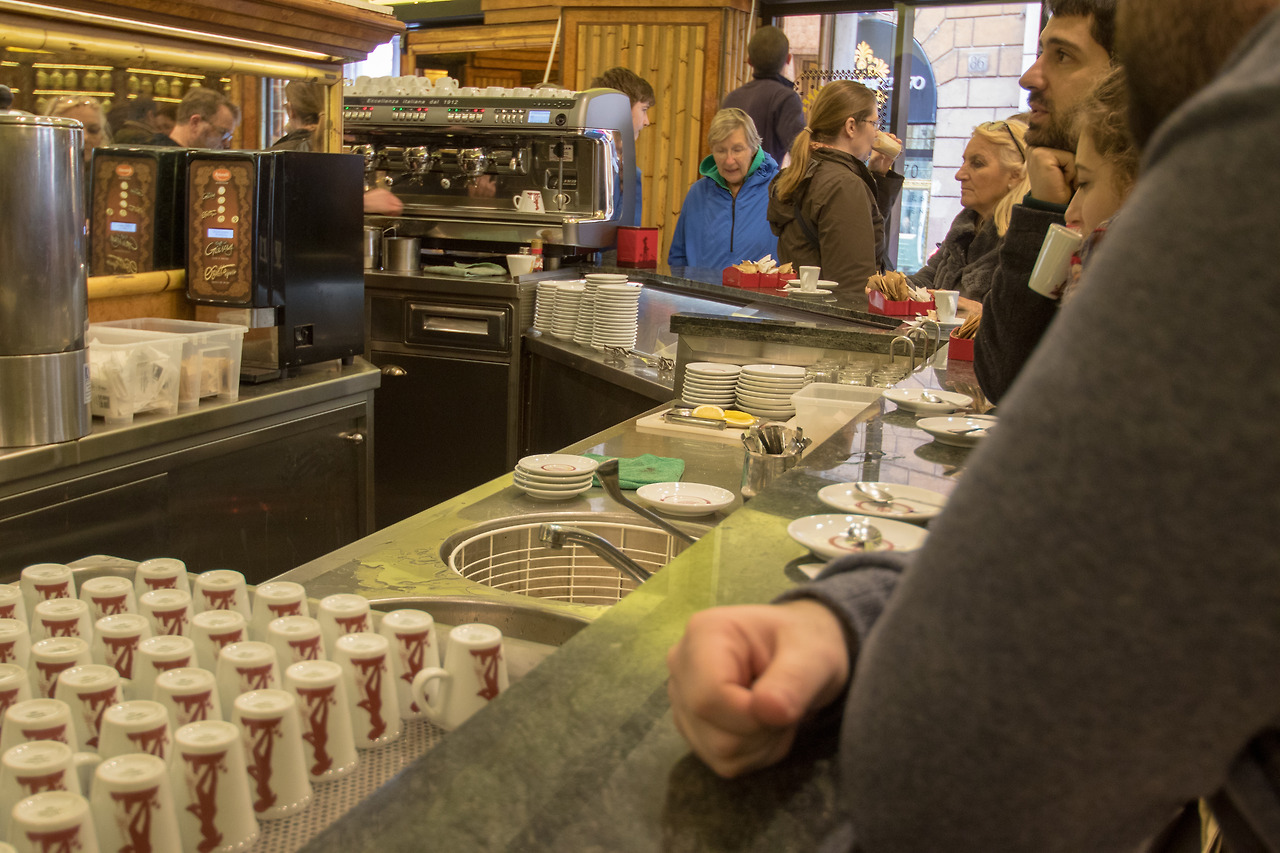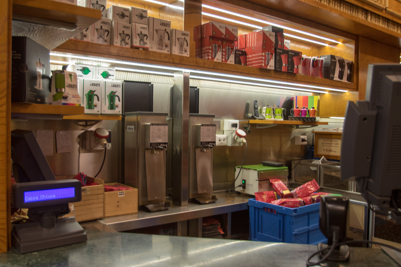 길쭉한 가게의 옆면에는 Torrefazione tazza d'oro 라고 쓰여있다. 로스터리(Torrefazione) 타짜도로( Tazza D'oro)라는 의미이다.