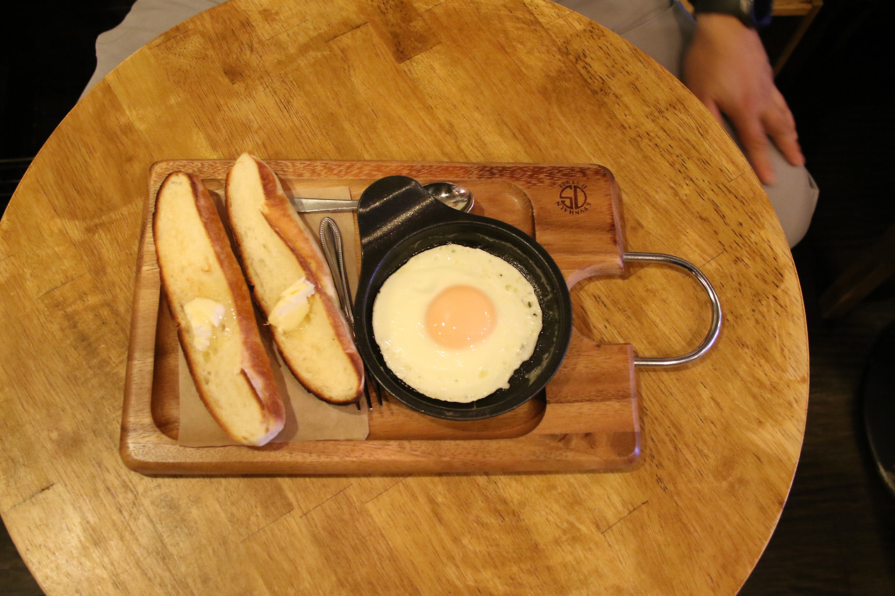 아침 토스트는 바게트 빵 두 조각에 계란 프라이를 곁들여서 팔고 있어요