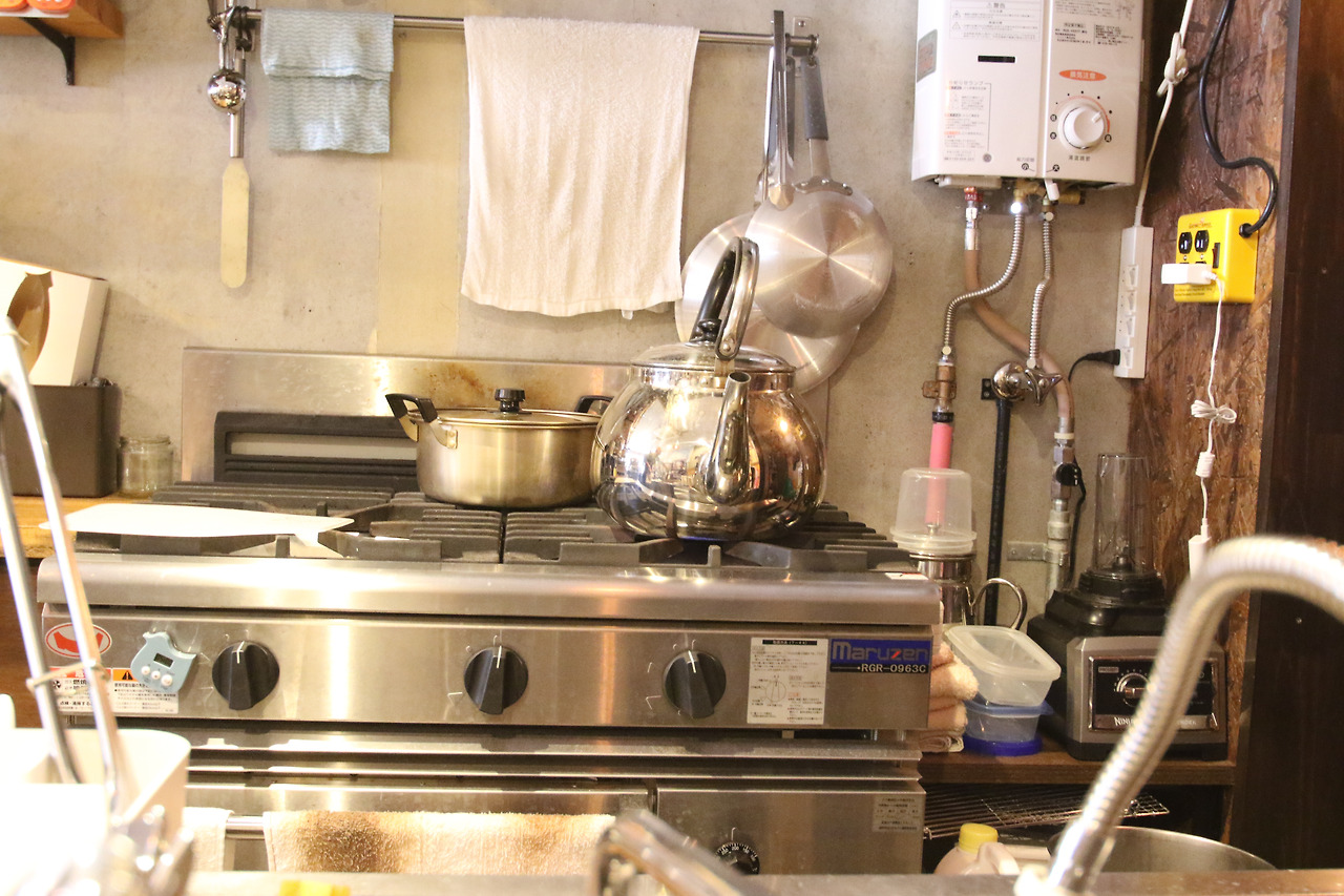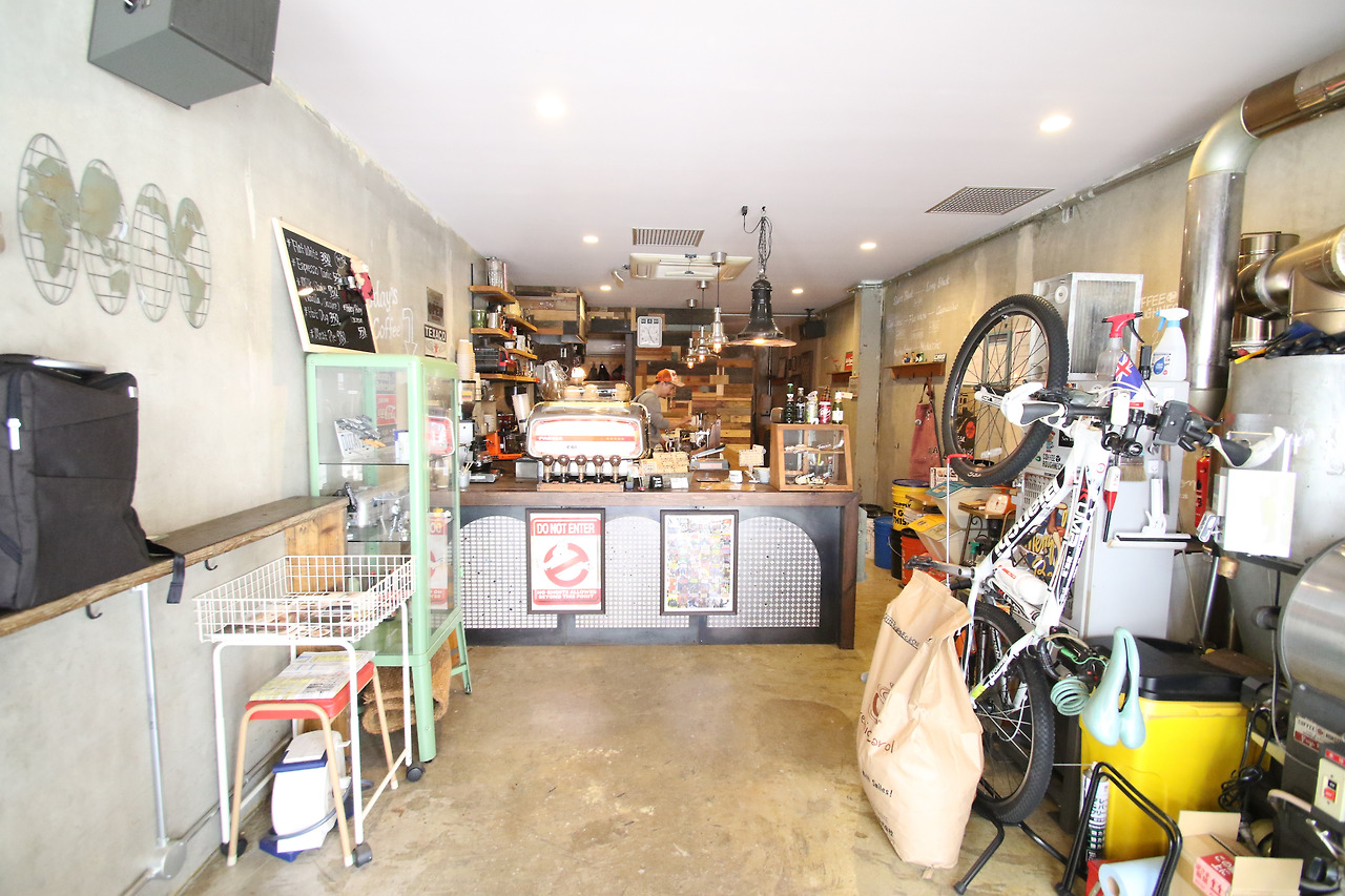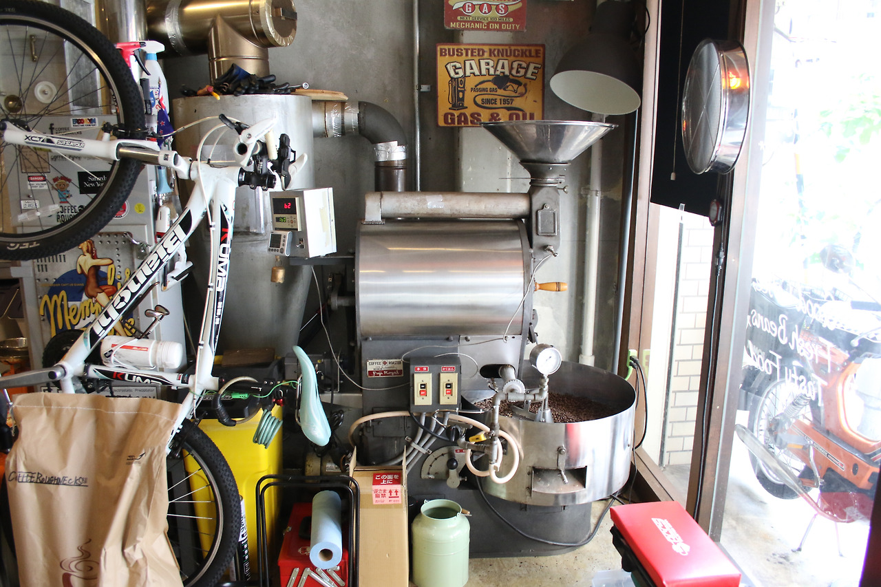 오른쪽에 로스터기가 있고 입구 맞은편에 주방이 있는 구조입니다.