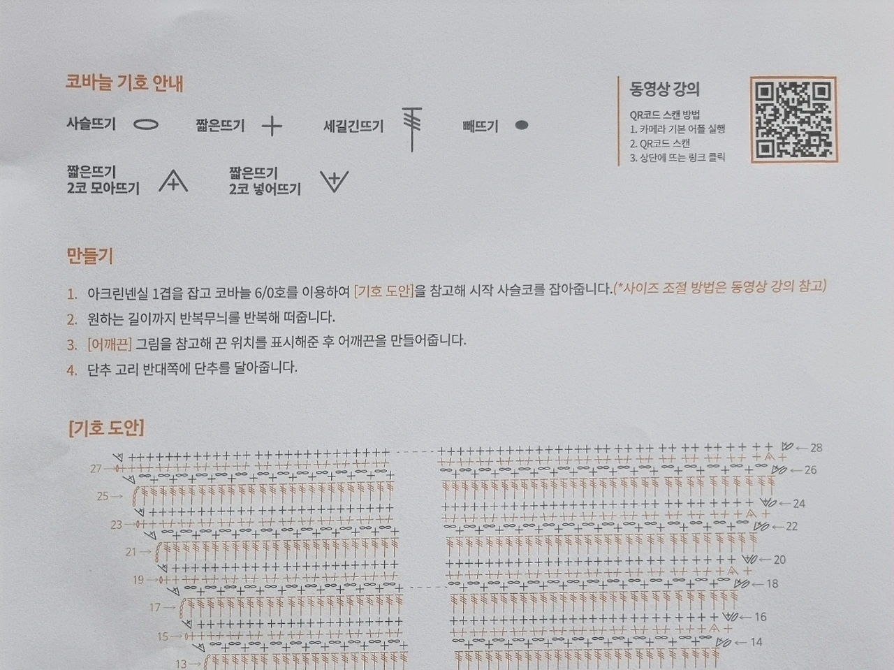 뜨개질을 할 때 도안을 보면서 하는데 크게 2가지 종류의 도안이 있다. 기호도안과 서술도안. 기호도안은 주로 일본에서 사용하기 시작했는데, 뜨기 기법별로 고유한 기호가 있어, 이를 바탕으로 그림과 기호를 사용해서 도안을 표시한다. 서술도안은 영미권에서 주로 사용되며 말그대로 줄글로 뜨개 방법을 상세히 설명해 놓은 도안이다. 예를 들어보면, 서술도안의 경우에는 '20코를 잡습니다. 1단: 모든 코를 겉뜨기 합니다. 2단: 모든 코를 안뜨기 합니다. 원하는 길이가 될 때까지 1단과 2단을 반복합니다.' 이렇게 작성되어 있고, 기호도안은 ㅜㅜㅜㅜㅜㅜㅜㅜㅜㅜㅜㅜㅜㅜㅜㅜㅜㅜㅜㅜ 이런식으로 기호로 표시하고 각 기호에 대한 설명이 적혀있다.