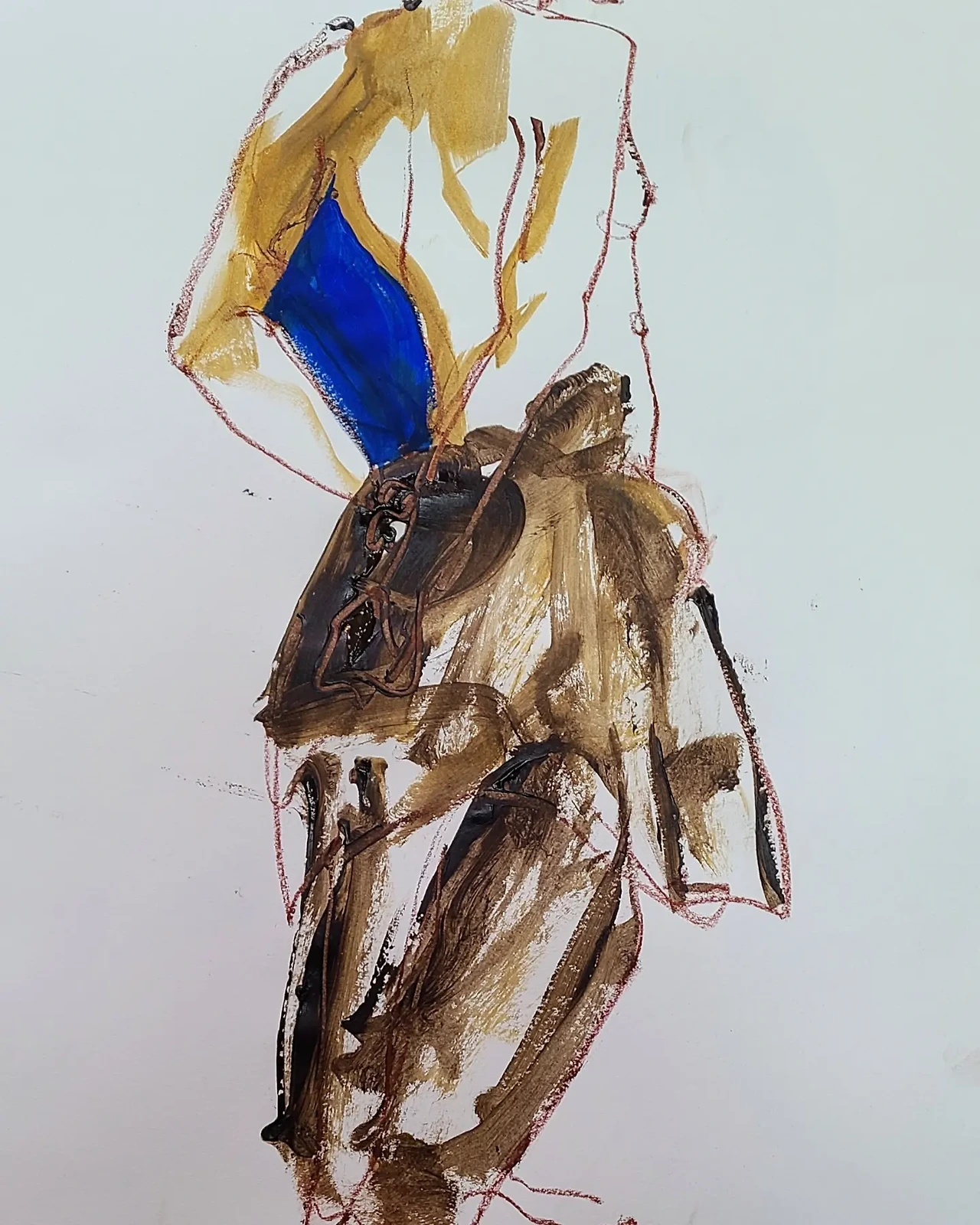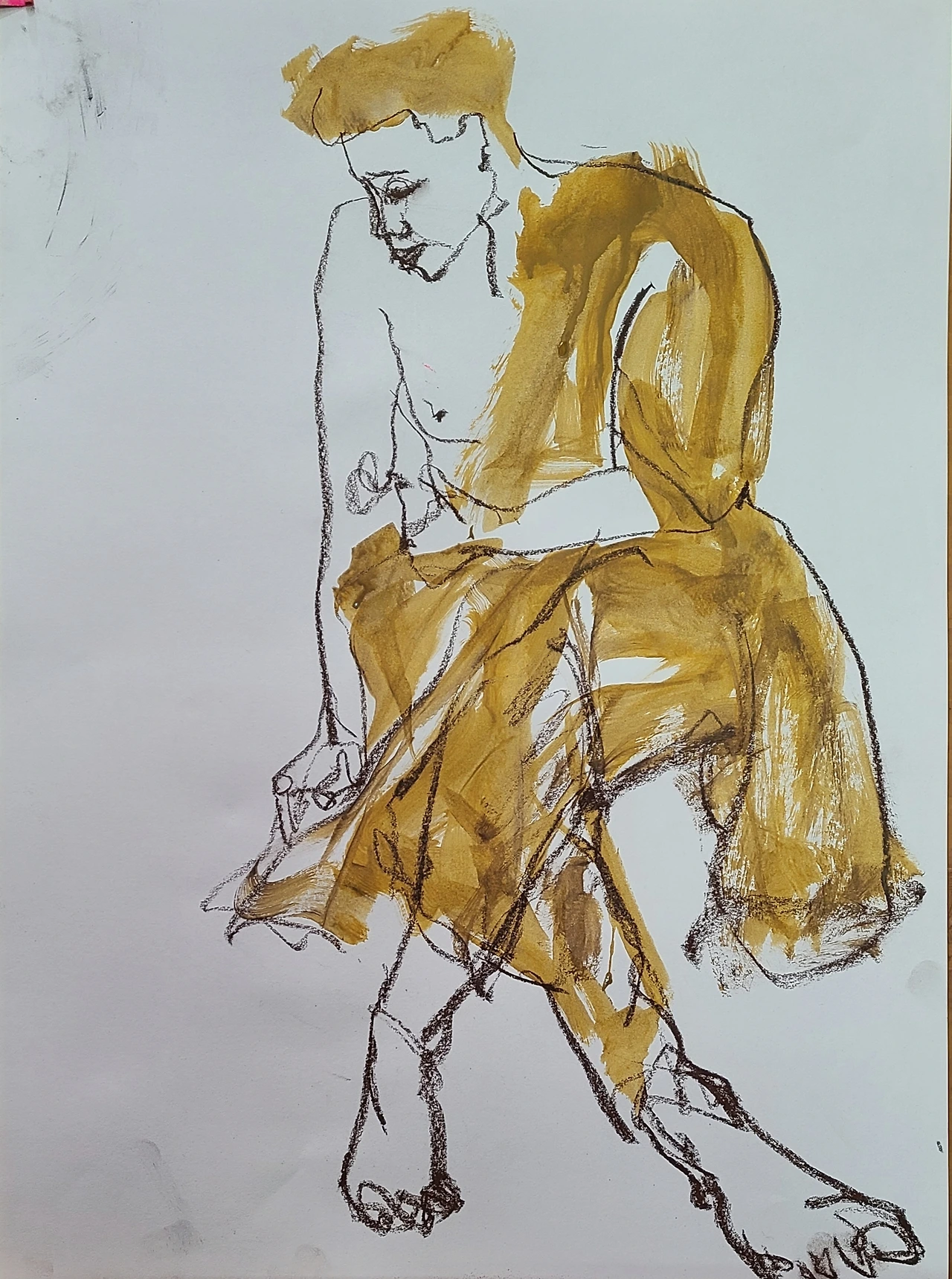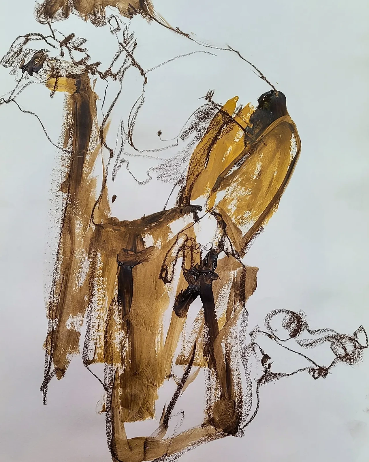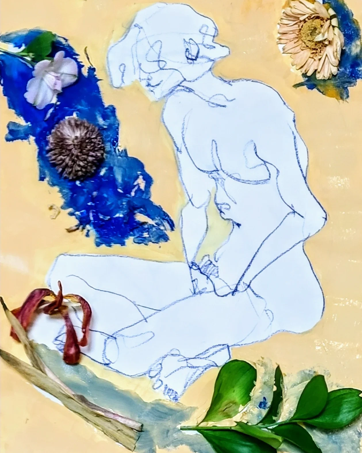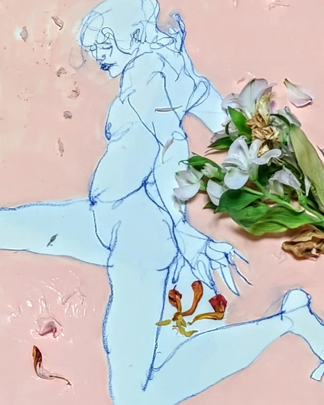 크로키 그림에 시든 꽃을 그려볼까 하다가 아예 꽃을 붙여봤습니다. 섞어본 거죠. 시간이 지남에 따라 꽃이 더 말라감에 따라 변화하는 그림이 탄생하는 순간이었습니다. 나름 잘 섞은 거죠.