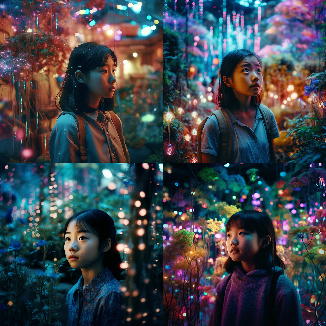 일단 미드저니의 사실적인 묘사 실력에 놀란다. 거의 사진과 다를 바 없다. 이 세상에 없는 소녀의 모습을 컴퓨터가 그려낸 것이다. 놀라는 일도 잠시 뿐. 정작 원하는 정보는 미래 정원의 모습이었으므로 소녀의 뒤에 보이는 식물의 반짝거리는 모습에서 AI가 상상하는 디지털 식물의 특성을 찾아본다.