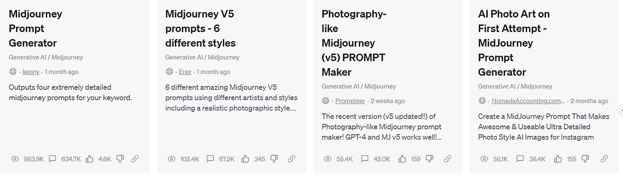알려진 바와 같이, Midjourney서비스는 영어를 더 잘 이해한다고 하니, ChatGPT에서 영어로 된 prompt를 만들어 달라고 요청하면, 다음과 같이 몇 가지 옵션을 가진 prompt를 만들어 준다. 나는 주로 Midjourney V5 prompt - 6 different styles라는 모델을 선택했다.