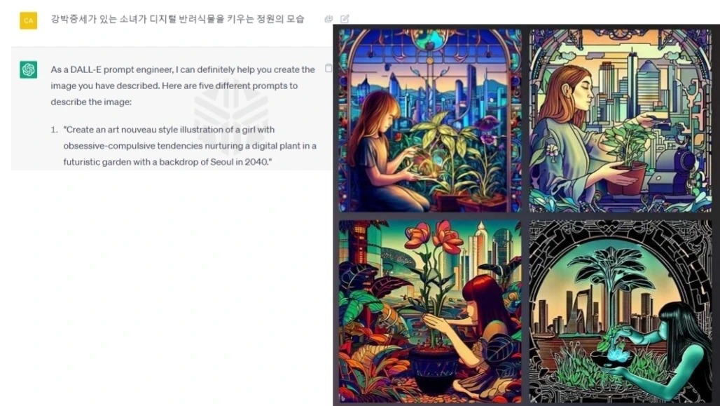 이번에는 제법 그럴듯하게, 2040년 디지털 반려 식물로 뒤덮인 서울의 모습과 그 속에 사는 한 소녀의 삶을 그려냈다고 본다. 그리고 이 이미지는 미래 정원의 모습을 상상할 수 있게 도움을 주었다.