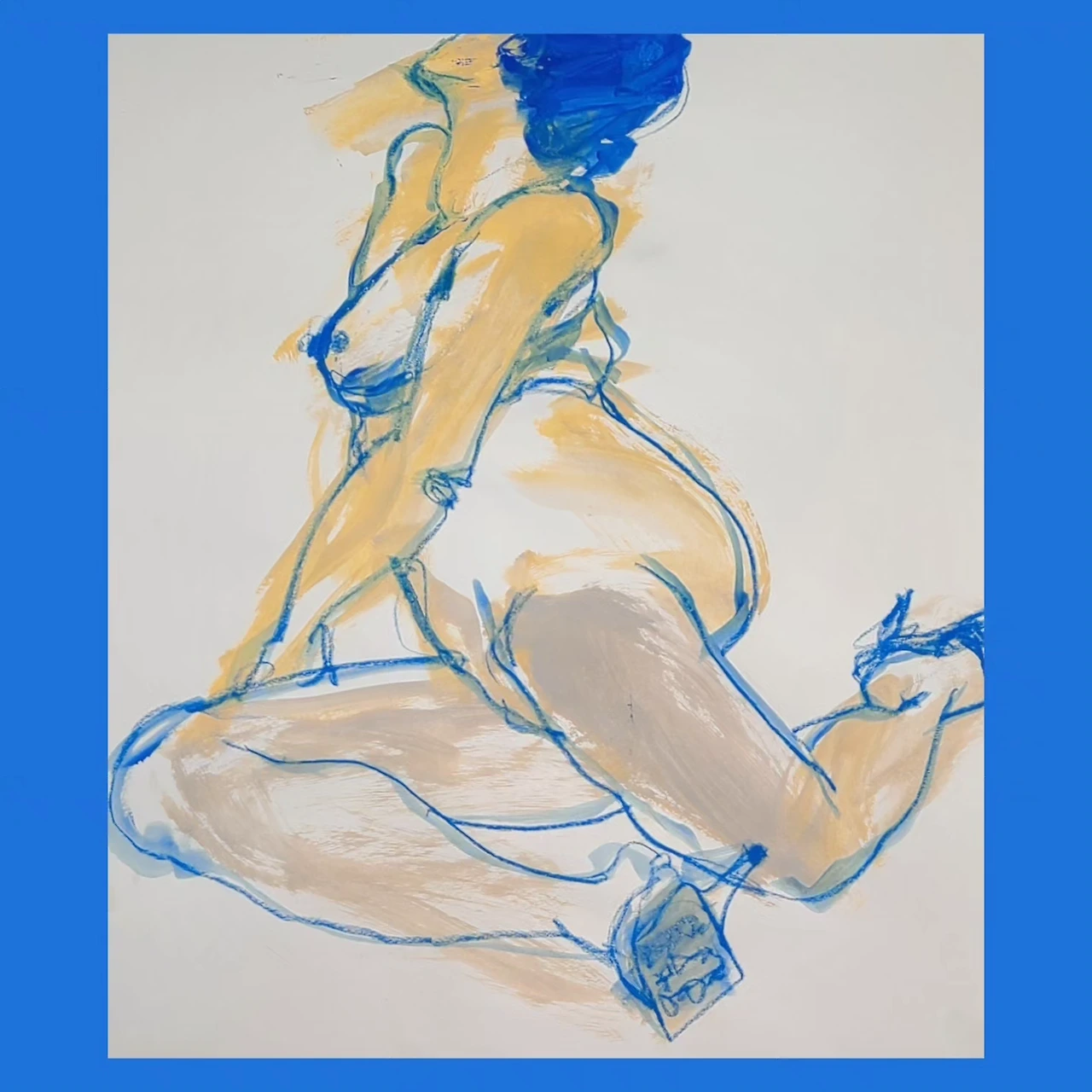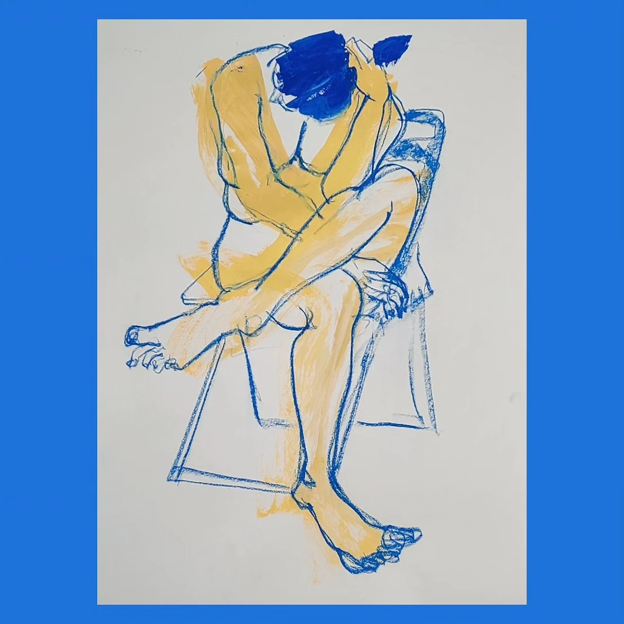 이 중 위 그림은 의자에 앉은 모델의 모습을 그려본 것인데요. 노랑이 신체의 밝은 면을 나타내는 듯한 착시를 불러일으켜서 의도치 않게 재미있게 결과물이 나온 작업입니다.