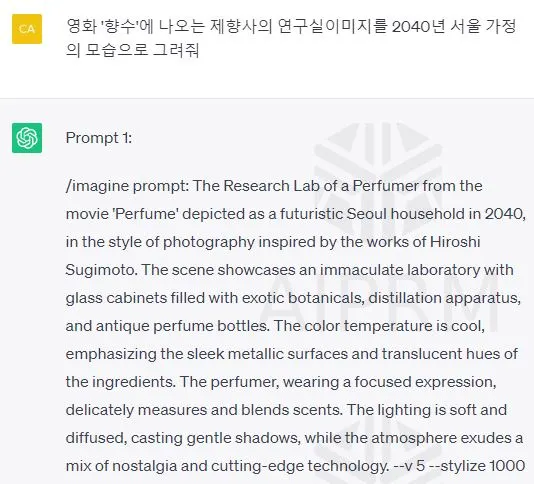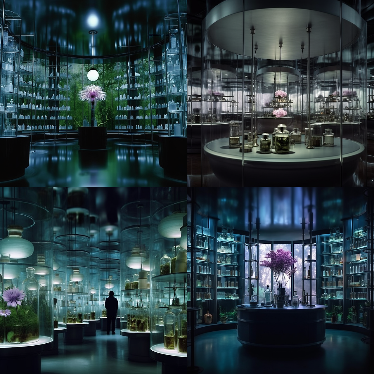 그래서 꽃 이미지의 링크주소를 미드저니 프롬프트에 추가로 입력하고, 꽃 이미지에서 영감 받을 정도를 --iw 0,3로 추가 입력했습니다. 그랬더니 어렴풋이 갖고 있던 꽃으로 가득 찬 미래의 연구실 이미지를 midjouney가 뚝딱뚝딱 만들어주더군요.
