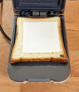 빵을 구우면 이렇게 노릇노릇해진다. 가운데에 들어간 치즈는 녹아내려서 두 식빵을 하나로 묶어주는 역할을 한다.