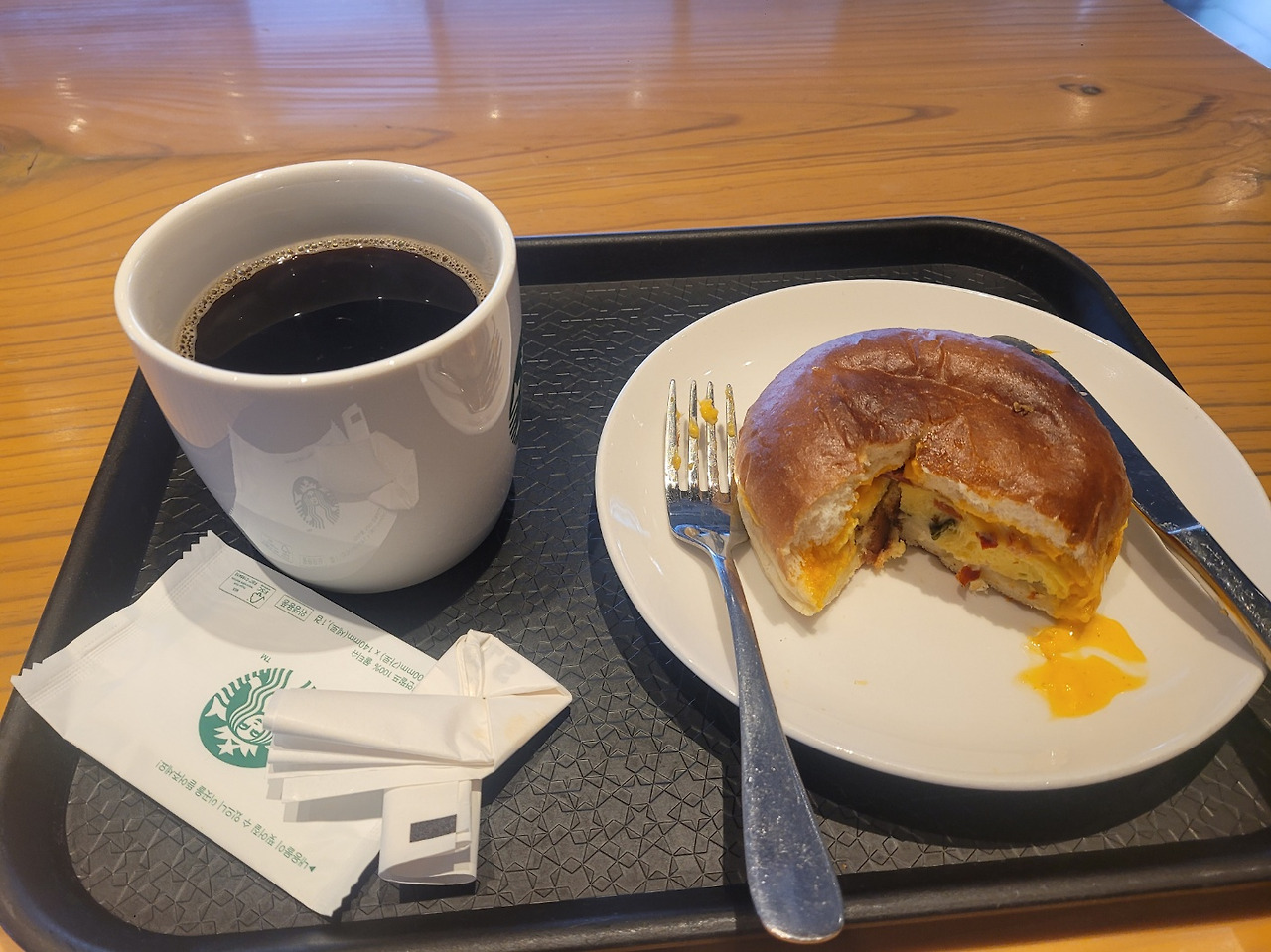 오늘도 스벅 죽돌이는 스벅을 왔어요..... 스벅의 모닝세트를 시키고 밖의 아침 풍경을 보며 배를 채웠다. 먹다보니 김씨가 도착했다. 김씨랑 근황 토크 좀 하다가 공부를 시작했다. 김씨는 아직 대학생인데, 지도 그리기 과제가 있다고 했다. (1시간을 넘게 지도를 그리고 색칠했다)