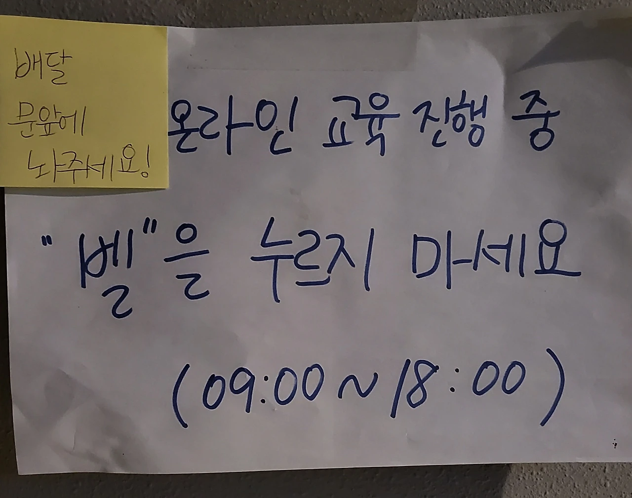 가운데 사진은 1년 넘게 현관문 옆에 붙여두고 있는 ‘방해금지 모드’ 안내입니다. 교육이나, 영상회의에 집중도를 높여줄 뿐만 아니라 상대방을 위한 배려의 수단으로 현관에 포스트잇이나 종이에 써서 붙이는 간단한 수고만 있으면 가능한 방법입니다.
