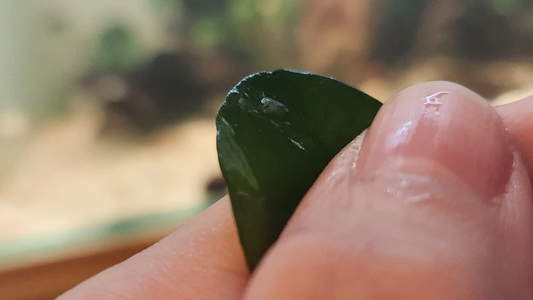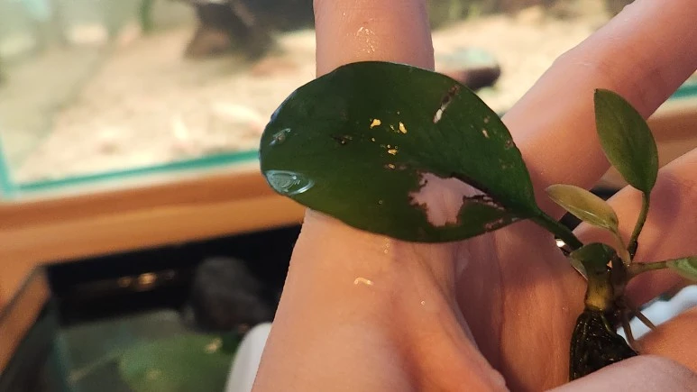 아누비아스 나나 SP.에서 발견 된 민물삿갓조개. 민물삿갓조개는 한 면만 껍데기가 있어서 이름은 일단 조개지만 실제로는 조개가 아닌 달팽이과다.