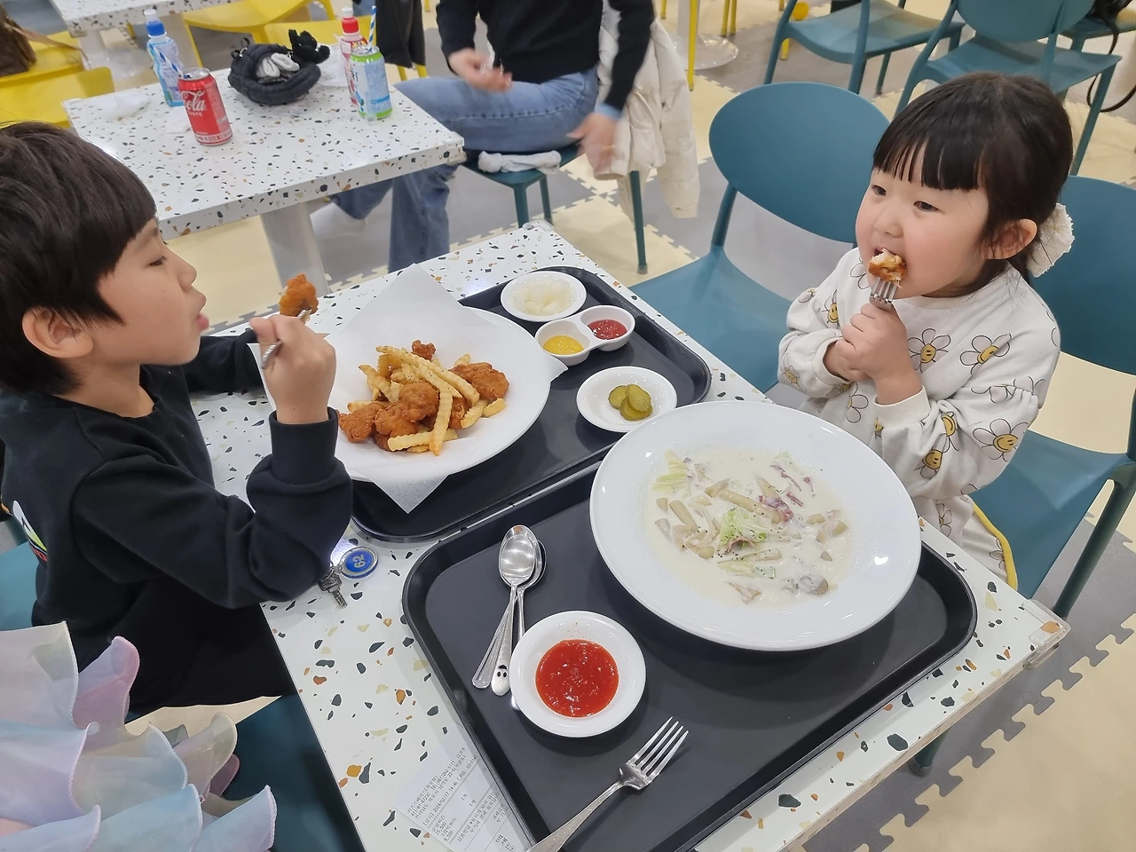 둘째는 크림떡볶이 소스는 맛있는 데 떡은 별로라며 피클만 소스에 연신 찍어먹었다.