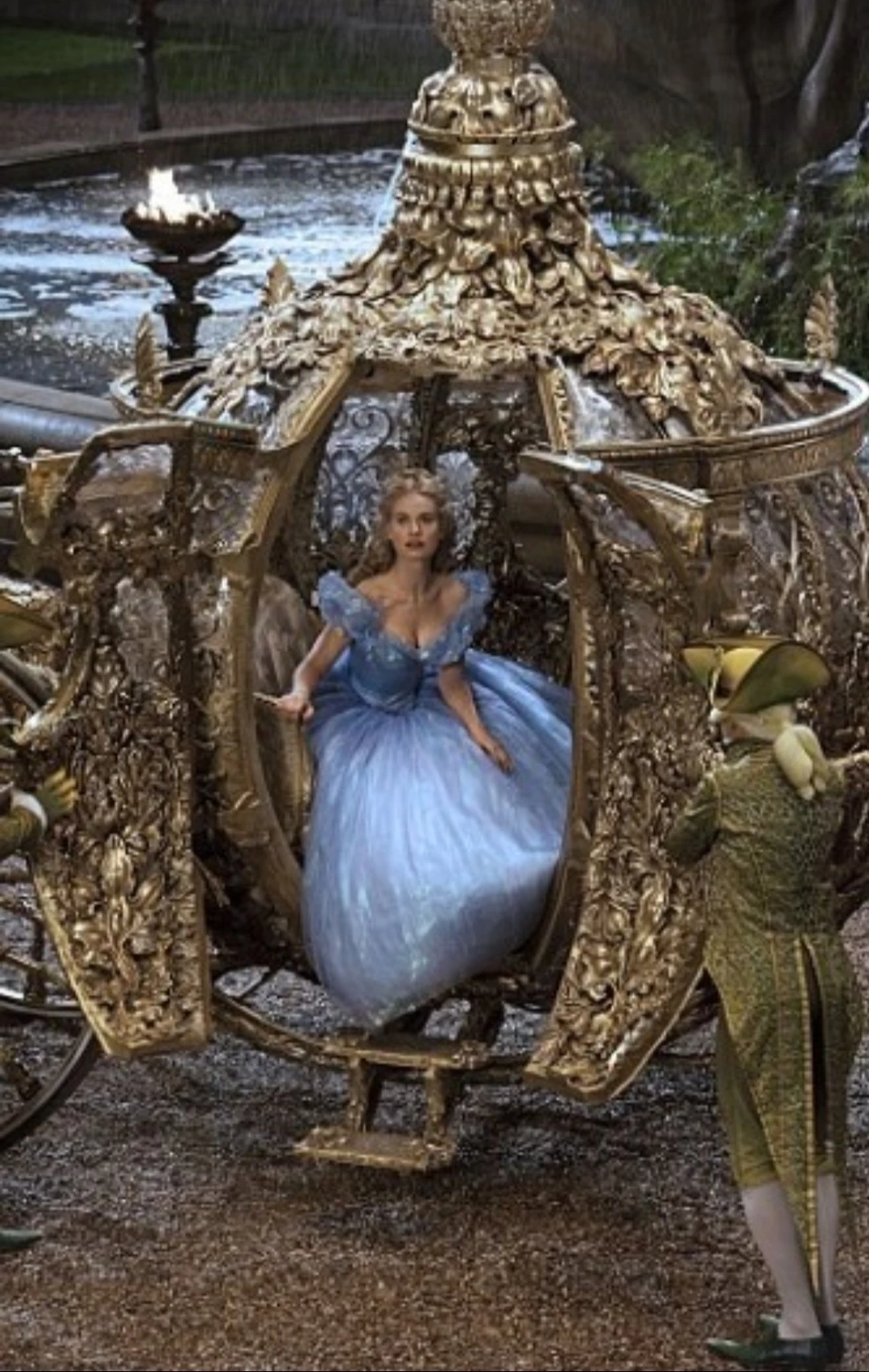 빛을 내는 황금마차의 열린 문으로 신데렐라가 긴장한 듯 하늘색 드레스를 한 손으로 살포시 잡고 있다. 어깨와 윗가슴선이 드러나는 민소매 하늘색 드레스는 그녀의 여리한 팔뚝과 탄탄한 가슴골을 감싸는 듯 드러내고 있다. 머리를 단아하게 묶어 늘어뜨린 신데렐라의 뚜렷한 이목구비들은 얼어있지만 그녀의 모습은 반짝이는 황금마차도 숨죽일 만큼 빛난다.