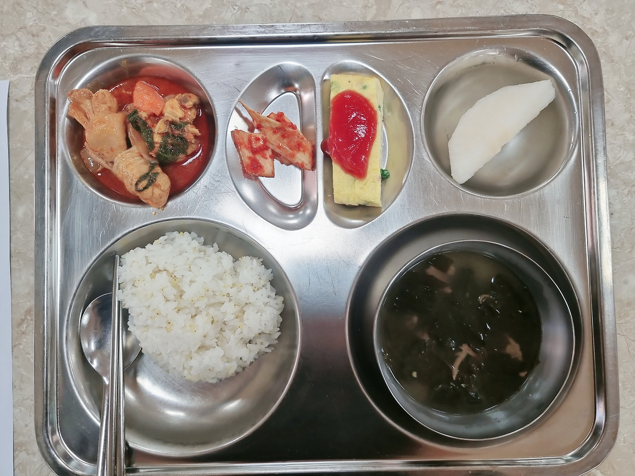 간에 기별도 가지 않을 양의 닭볶음탕과 김치, 계란말이, 배 두쪽이 있었고 내가 코를 박고 먹을 만큼 좋아하는 미역국옆엔 평소의 내 양의 반도 안 될 것 같은 밥 한 주걱이 있었다.