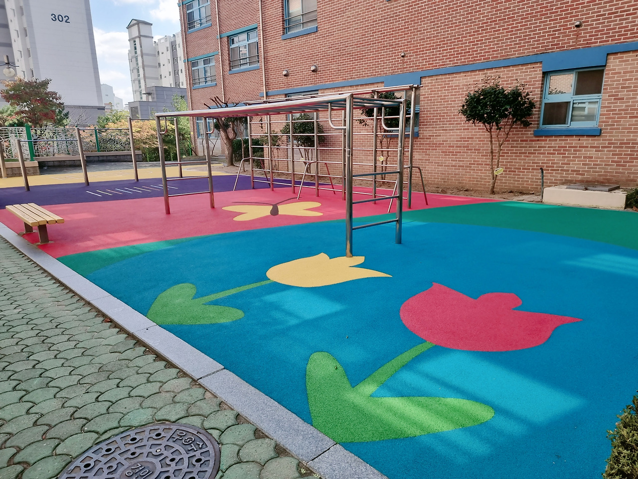 그렇게 이유 모를 아쉬움을 뒤로 교문으로 향하는 데 이전엔 작은 모래터였던 철봉놀이터가 그새 바뀌어있었다. 이번 방학 때 계속 공사한다고 했던 게 이거였구나.