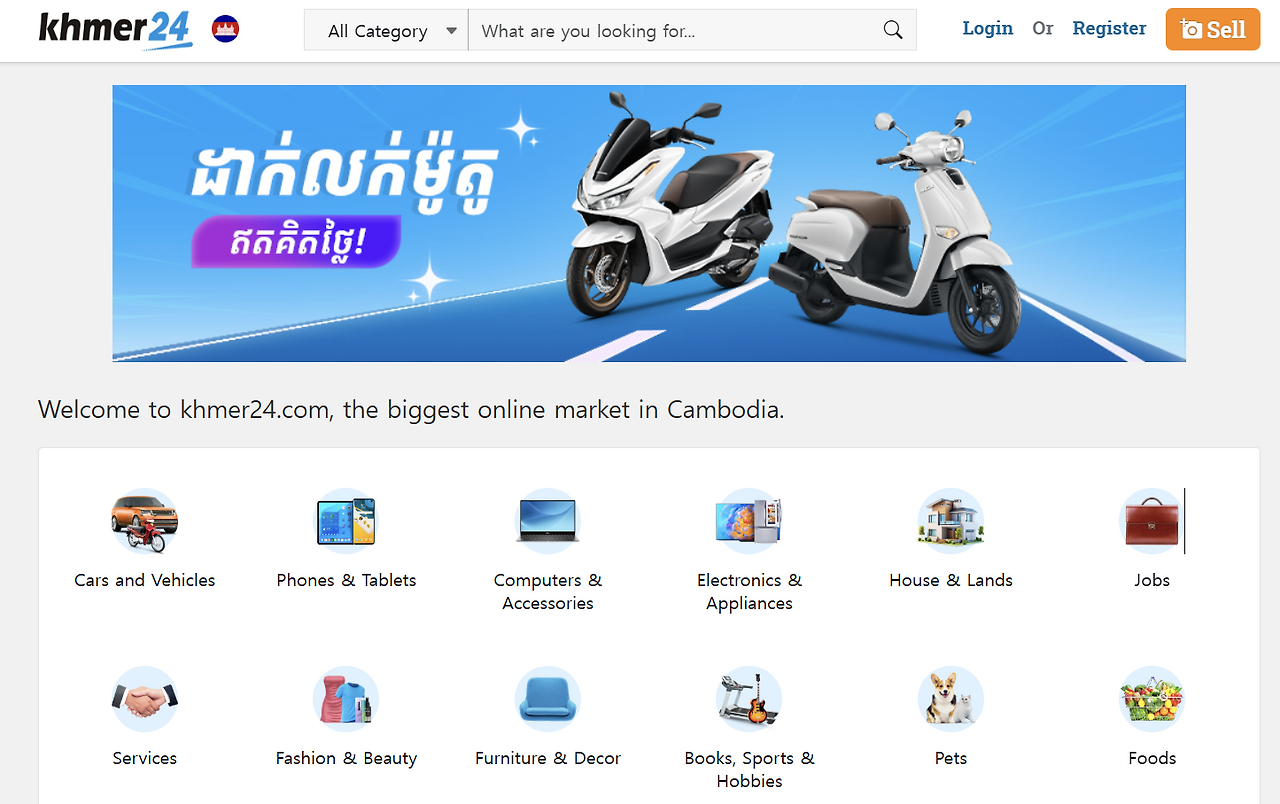 두 번째는 크메르 24(Khmer24)이다. 웹사이트와 앱 모두 운영 중인 캄보디아의 대표 온라인 마켓이다. 부동산 임대, 차량 매매, 중고거래, 일반 상점 상품 등 다양한 정보가 올라오며, 네이버 스토어, 네이버 부동산, 중고나라를 합쳐 놓은 듯한 느낌이라고 칭하겠다. 제품 사진과 가격이 상세히 안내되어 있으며 앱 내 채팅도 지원하지만, 크메르 24의 채팅 응답은 다소 느릴 수 있어, 상품 설명에 기재된 텔레그램 번호로 직접 연락하는 것이 더 빠른 답을 받을 수 있다. 결제는 대부분 QR을 통해 이루어지고, 배송은 개별 조율해야 하기에 다소 번거롭게 느껴질 수 있다.