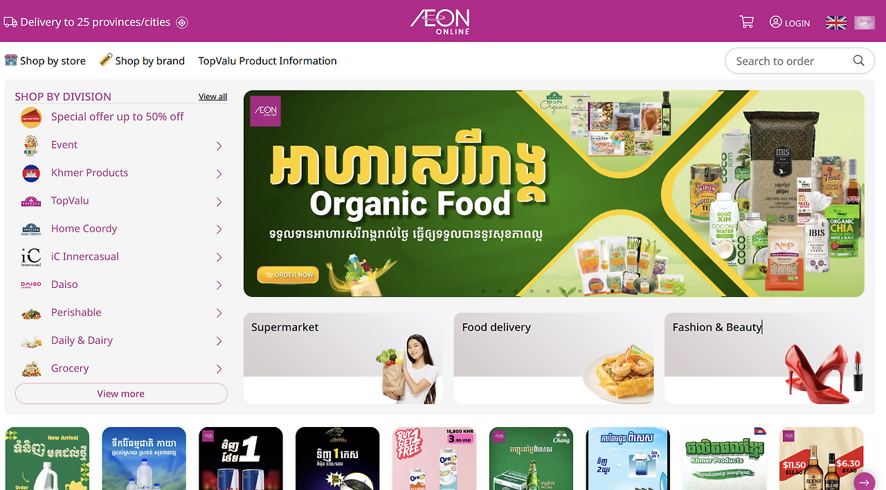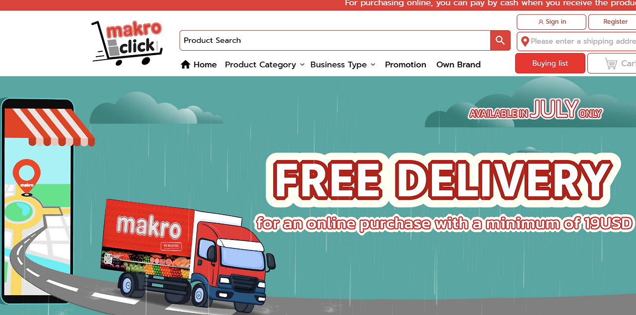 세 번째는 Makro cambodia와 Aeon online이다. 프놈펜 도시권에서는 마트 배송도 가능한데, Makro Cambodia와 Aeon Online을 통해 이마트 24나 홈플러스처럼 식료품 및 생필품을 배달받을 수 있다. 무거운 생수나 세제처럼 직접 들고 오기 힘든 물품 구매 시 유용하며, 간혹 고기 부위가 바뀌거나 우유가 미지근하게 도착했다는 후기도 있으므로 신선식품은 피하는 것을 추천한다. 대부분 다음 날 배송되지만 주문 시간에 따라 2일 정도 걸릴 수도 있는 것이 단점이다.