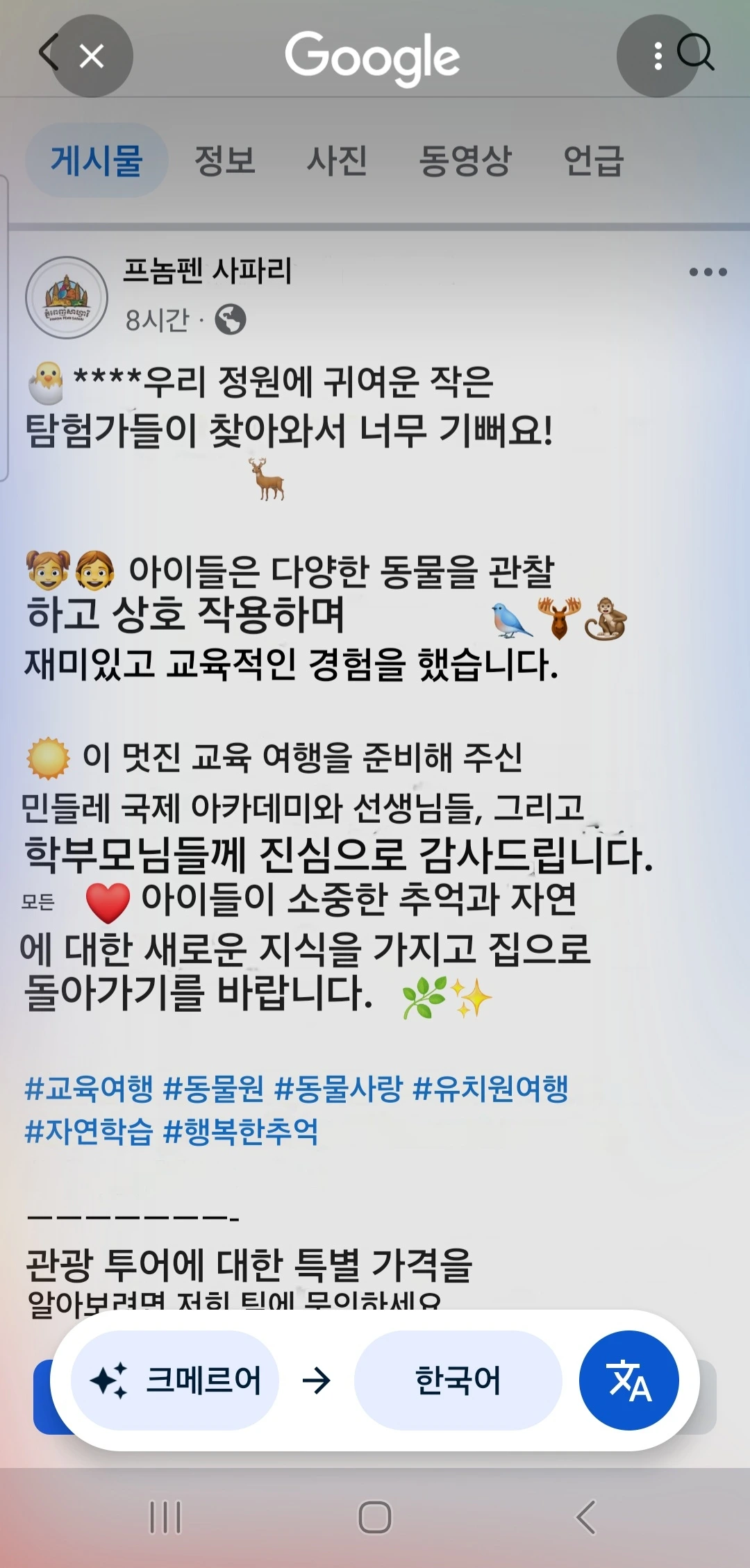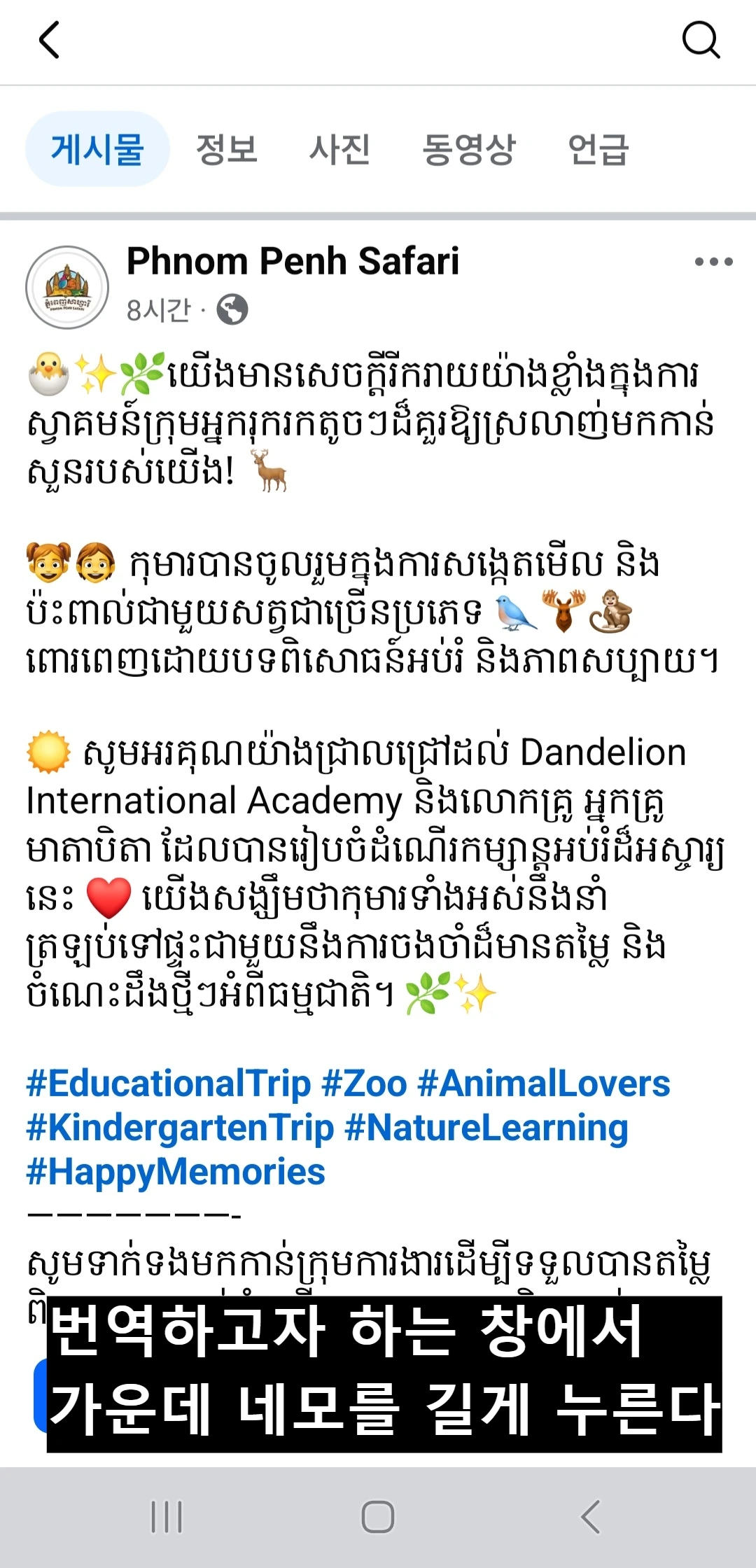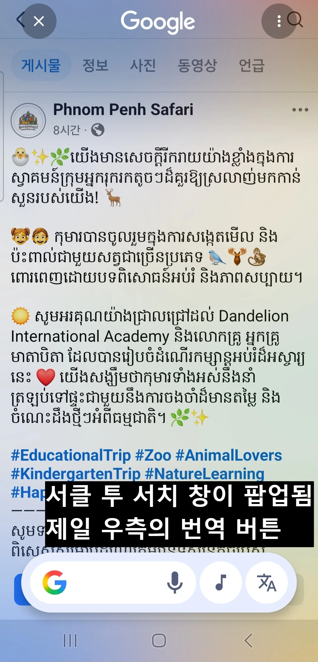 갤럭시의 경우, 화면 속 글자를 바로 번역하고 싶다면 ‘서클 투 서치’ 기능이 좋다. 화면 하단 중앙의 네모 버튼을 길게 누르면 번역 아이콘이 뜨고, 바로 번역을 확인할 수 있다. 이미지를 찍어 확인해야 하는 경우에는 구글 렌즈와 큰 차이가 없지만, 웹페이지나 페이스북, 사진첩 속 크메르어 텍스트를 볼 때는 훨씬 편리하다. 카메라 모드에서도 실행 가능해 속도가 빠르다는 점에서 개인적으로는 구글 렌즈보다 선호한다.