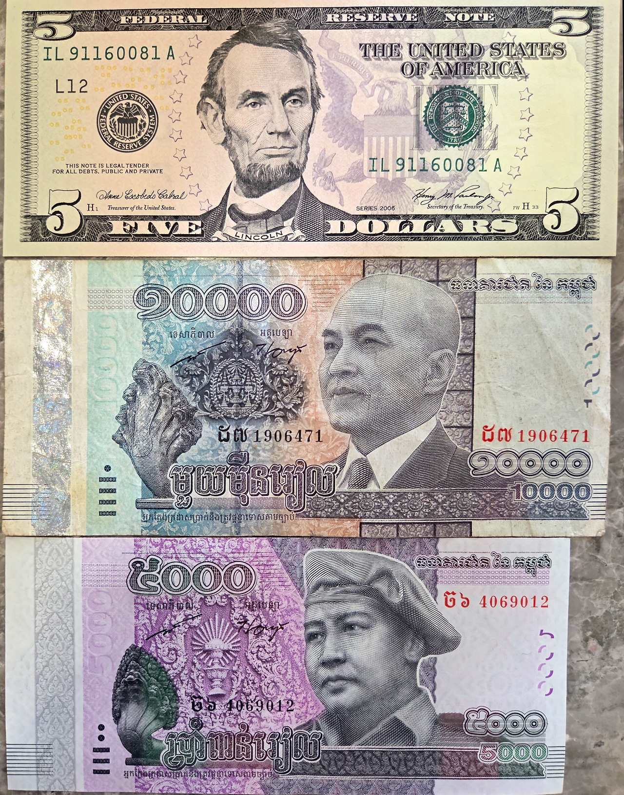 자본이 부족했던 캄보디아는 자국 화폐를 계속 찍어내다 보니 리엘의 가치가 급격히 하락했고, 그로 인해 사람들이 안정적인 달러(USD)를 더 선호하게 되었다. 오늘날 캄보디아의 많은 상점에서는 리엘과 달러가 병행 사용되고 있다. 특히 외국인에게는 대부분 달러로 가격을 안내한다. 달러만 환전해 오면 일상적인 결제는 문제가 없으며, 달러 환율이 곧 체감 물가이다.