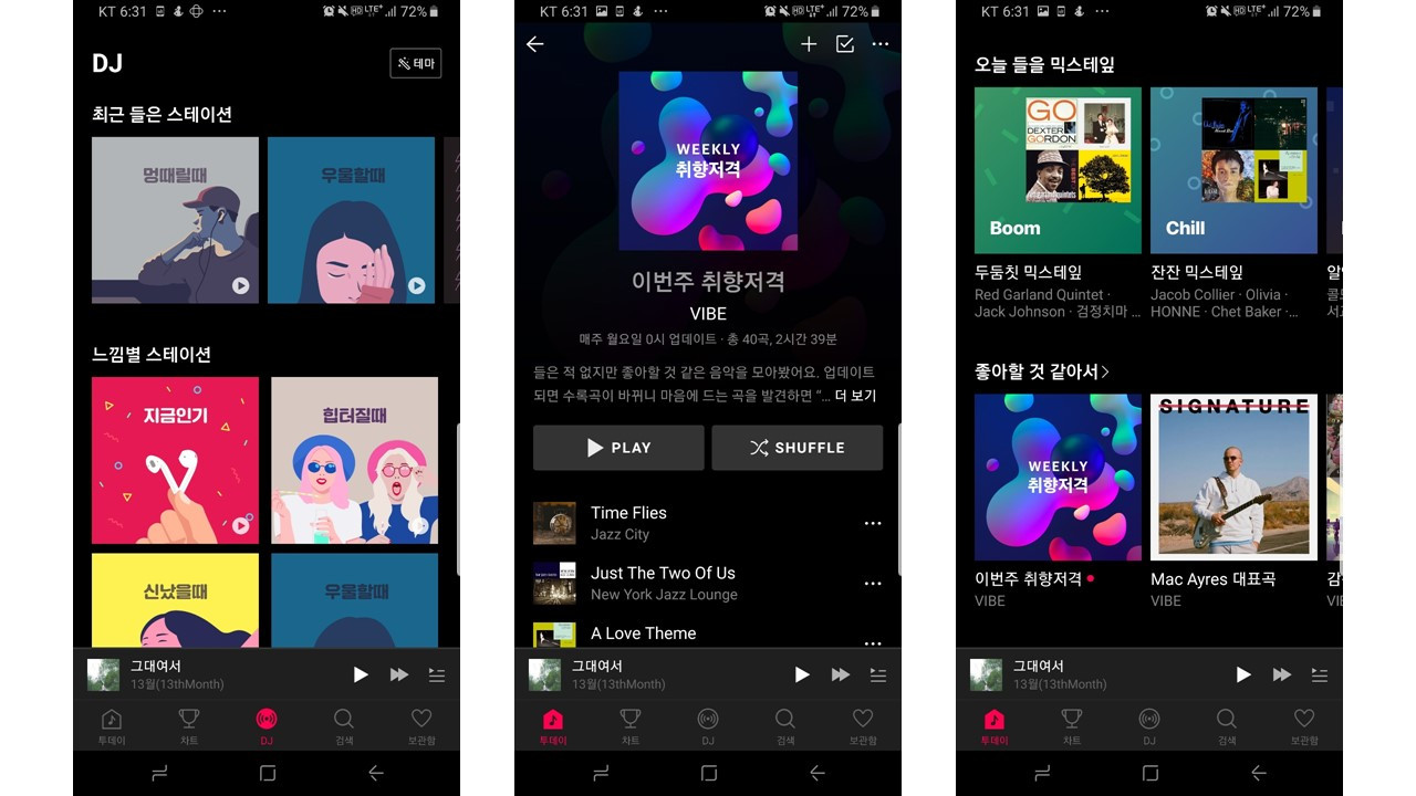 믹스테이프, 스테이션, 취향저격 등의 플레이리스트 기준의 큐레이션을 제공하는 네이버의 VIBE