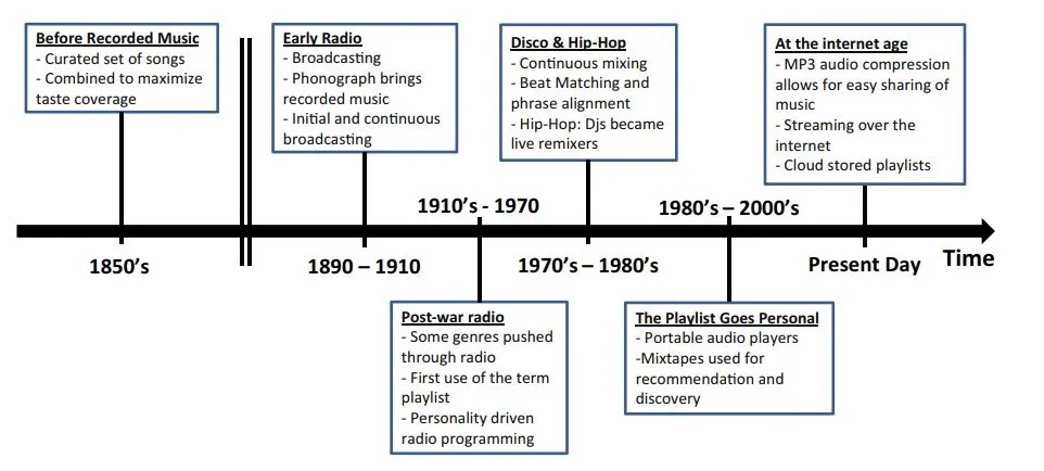 플레이리스트의 정의에 의하면 플레이리스트는 스트리밍 시대의 새로운 개념이 아니다. 음악을 고르고 선택해 듣는 일은 대중음악의 등장과 거의 함께 했다. 1890년대부터 라디오가 보급되기 시작하면서, 락앤롤과 알앤비와 같은 장르가 유행하기 시작했다. 그래서 그러한 음악의 장르를 소개하기 위해 프로그램을 구성하는 과정에서 라디오 호스트의 개성, 취향에 의해 재생 목록이 구성되며 플레이리스트가 만들어졌다.