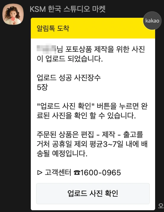 각 사진당 20장씩, 총 100장을 주문했다. 네이버에서 엽서 사이즈 선택 및 수량 선택을 한 후 결제 진행한 후, 사진 업로드 및 신청을 한다. 그러면 아래와 같은 카톡이 오는데 '사진장수' 확인 및 '업로드 사진 확인'을 눌러 제대로 업로드되었는지 확인하면 된다.