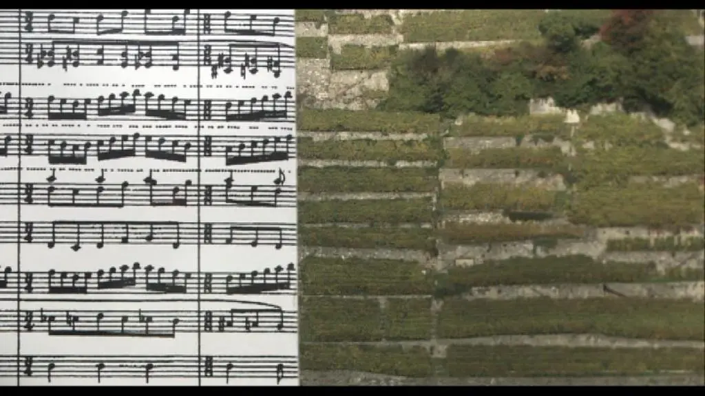 호수 위 배에서 본 포도밭이 스트라빈스키의 악보와 나란하다. 리허설을 위한 스튜디오는 라뮈가 말한 대로 파란색으로 칠했다. 가수와 연주자가 각자의 박자를 연주하다가 결국에 일치시키는 장면은 니진스키가 무용수들에게 <봄의 제전>의 박자를 불러주던 모습을 떠올리게 한다.