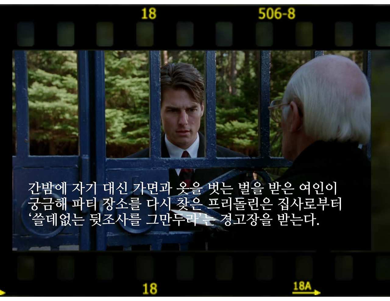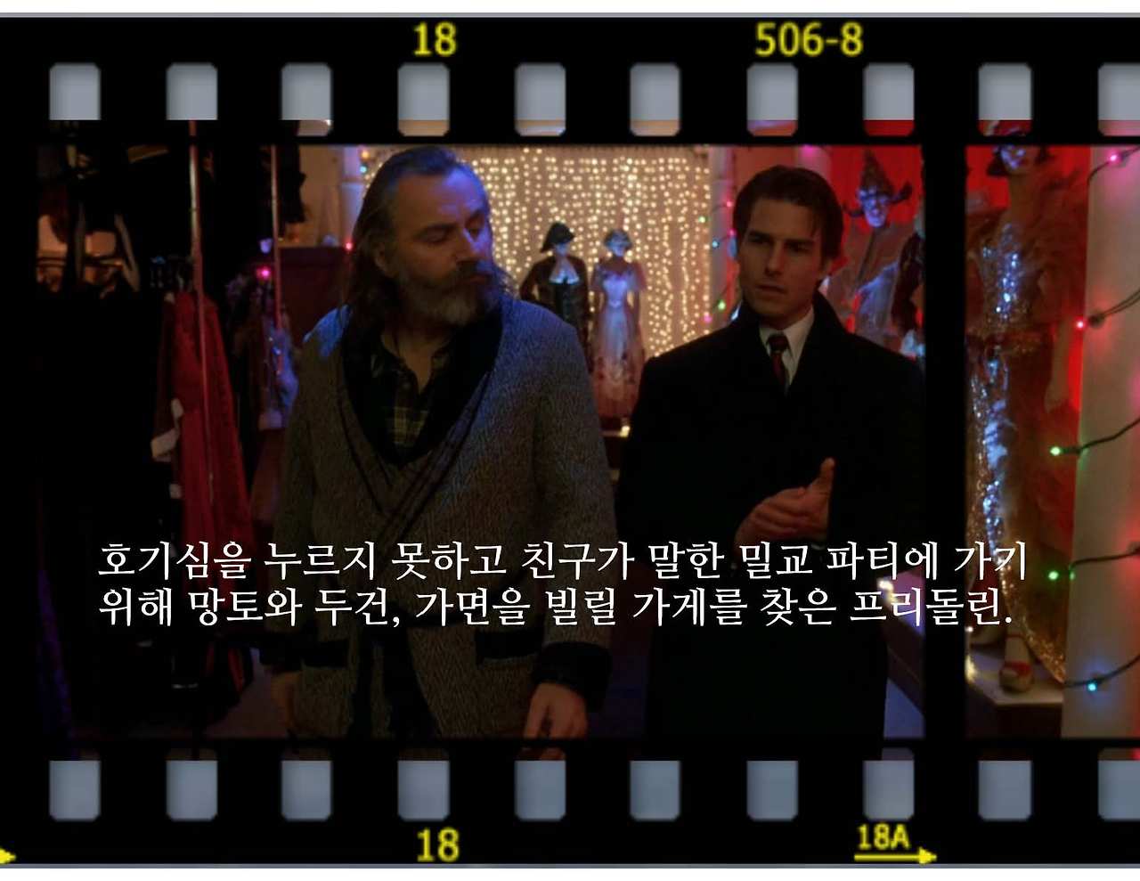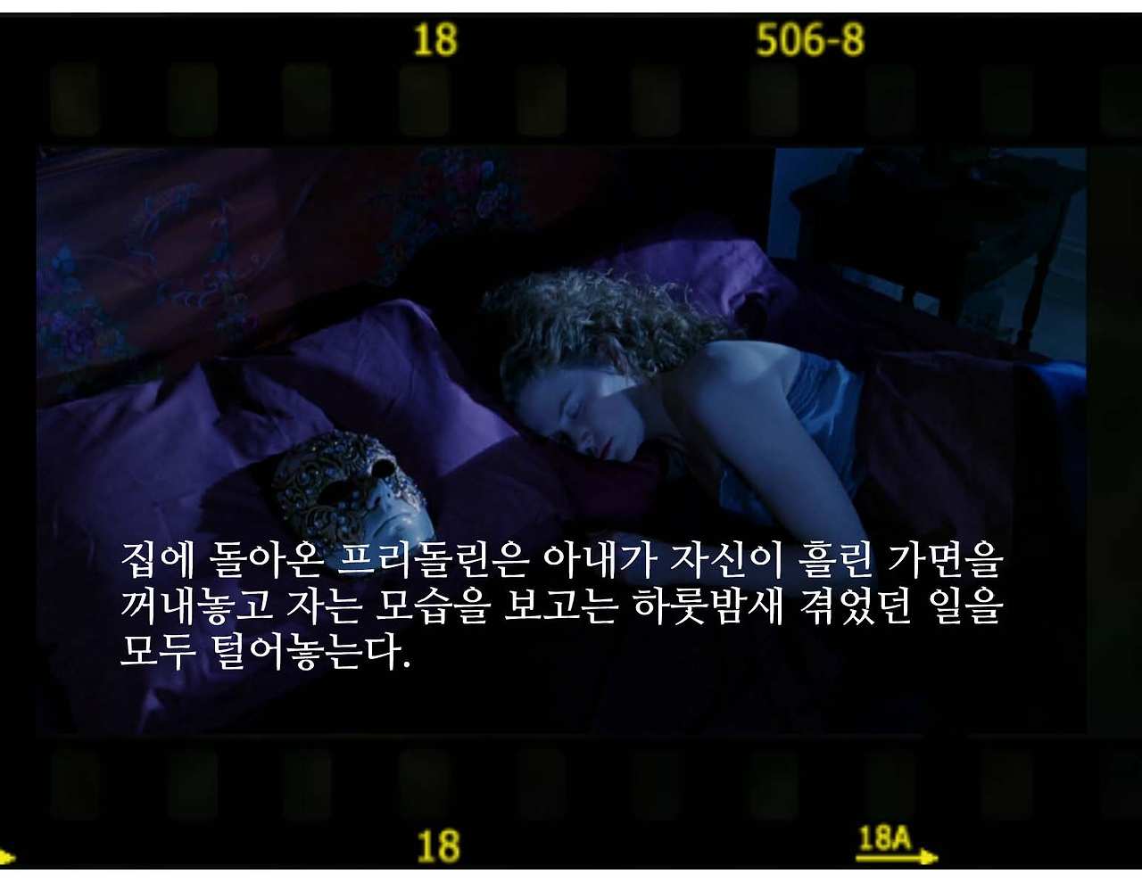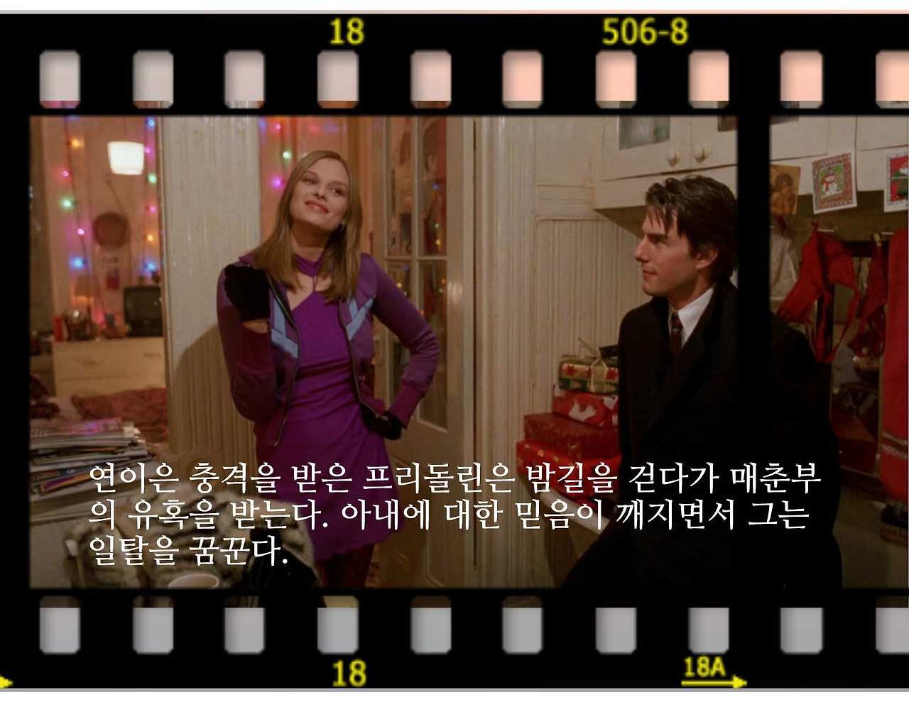 화면에 비친 영화 <블룸 인 러브Blume in Love>는 이혼 전문 변호사 블룸이라는 남자가 전처와 현 애인, 자신의 비서 사이에 갈피를 잡지 못하고 베네치아에서 방황하는 이야기이다. 큐브릭은 이 영화가 주 선율로 쓴 노래 ‘빈, 나의 꿈의 도시’를 <아이즈 와이드 셧>으로 단 1초쯤 가져온 것이다. 아는 사람은 알 것이라는 큐브릭의 선물이다.