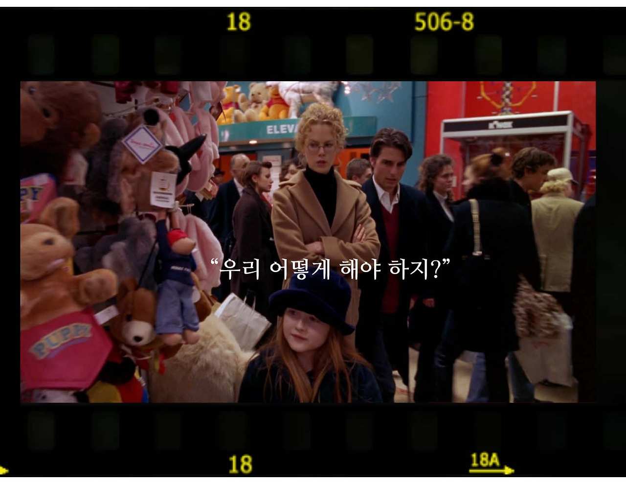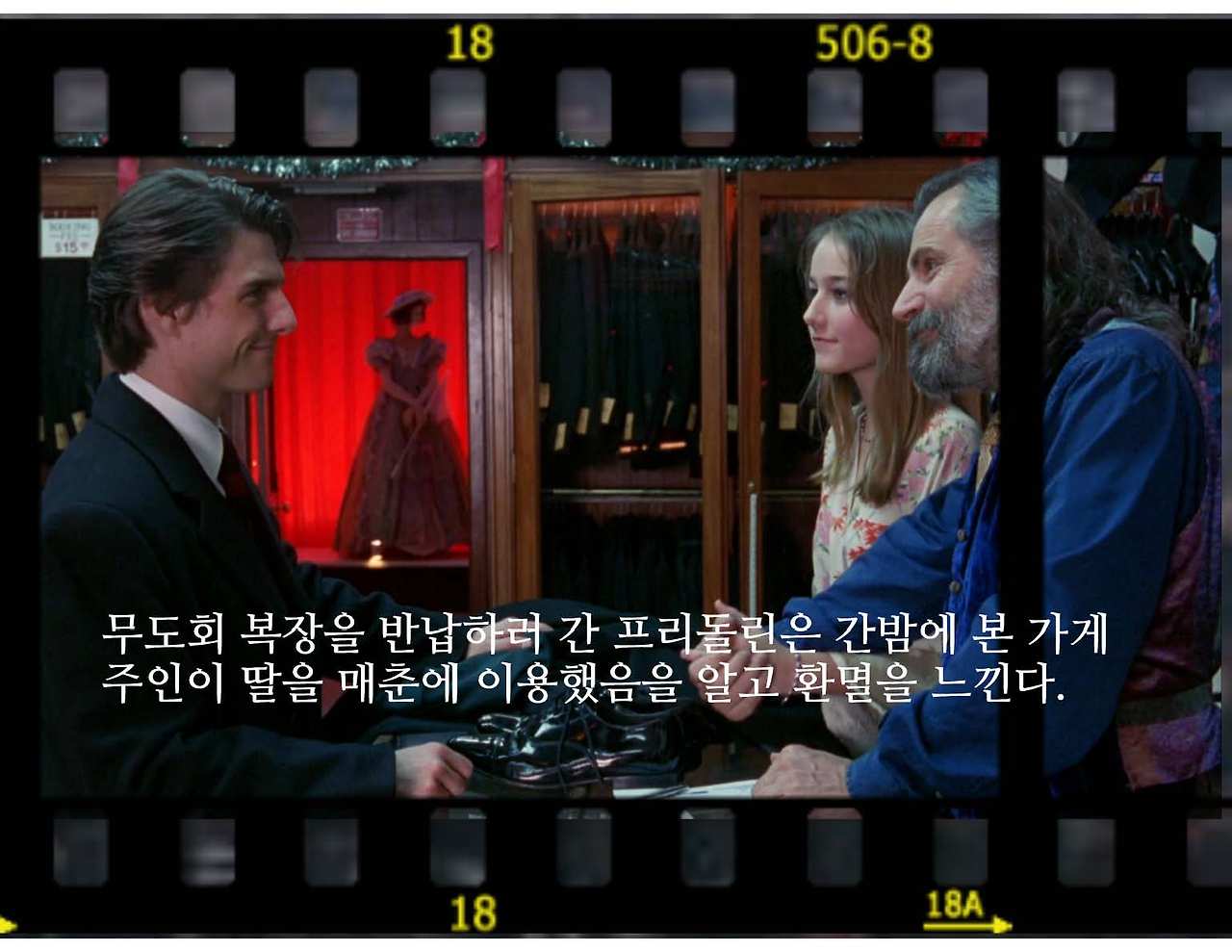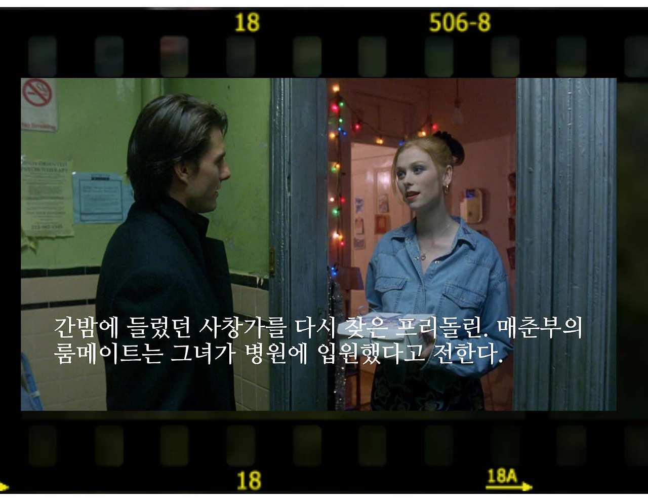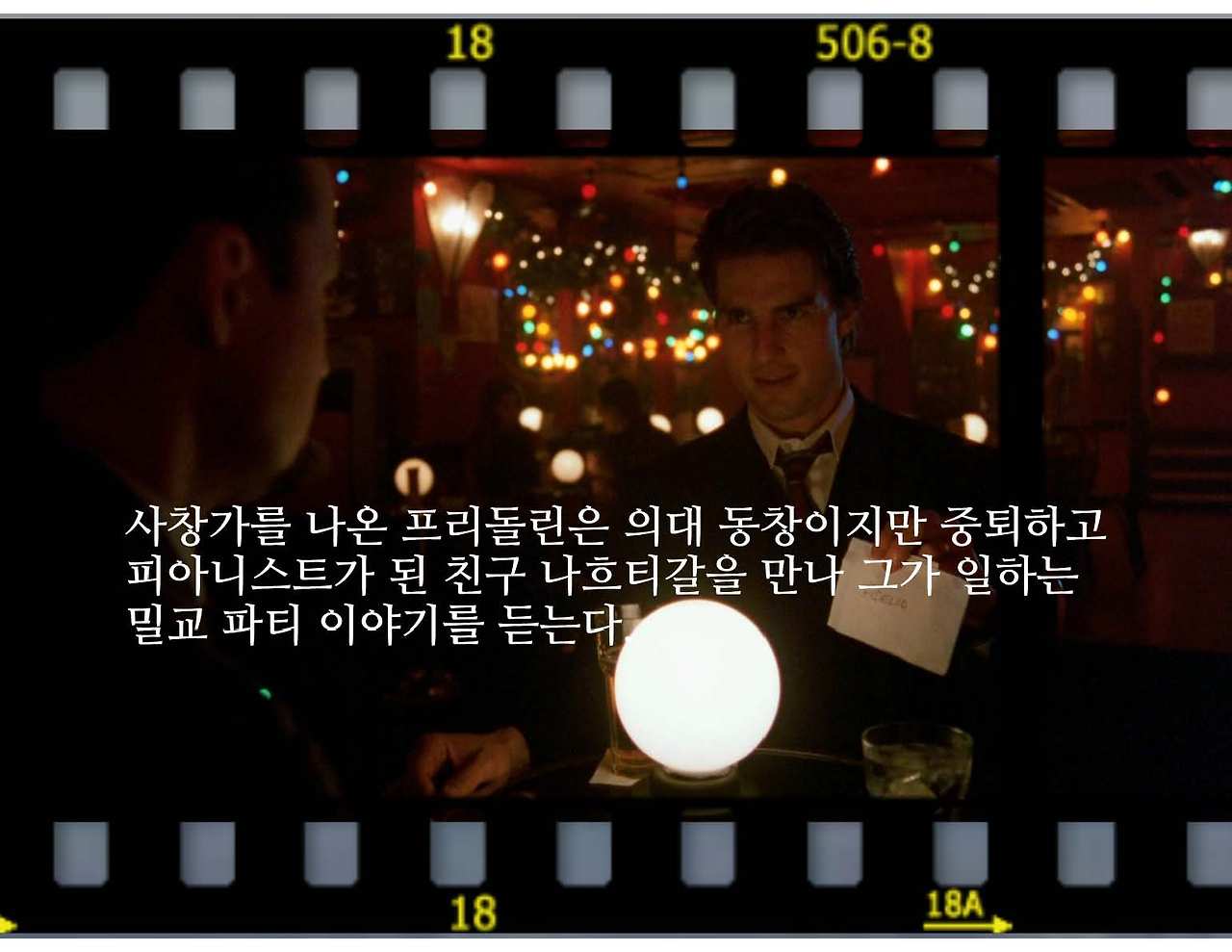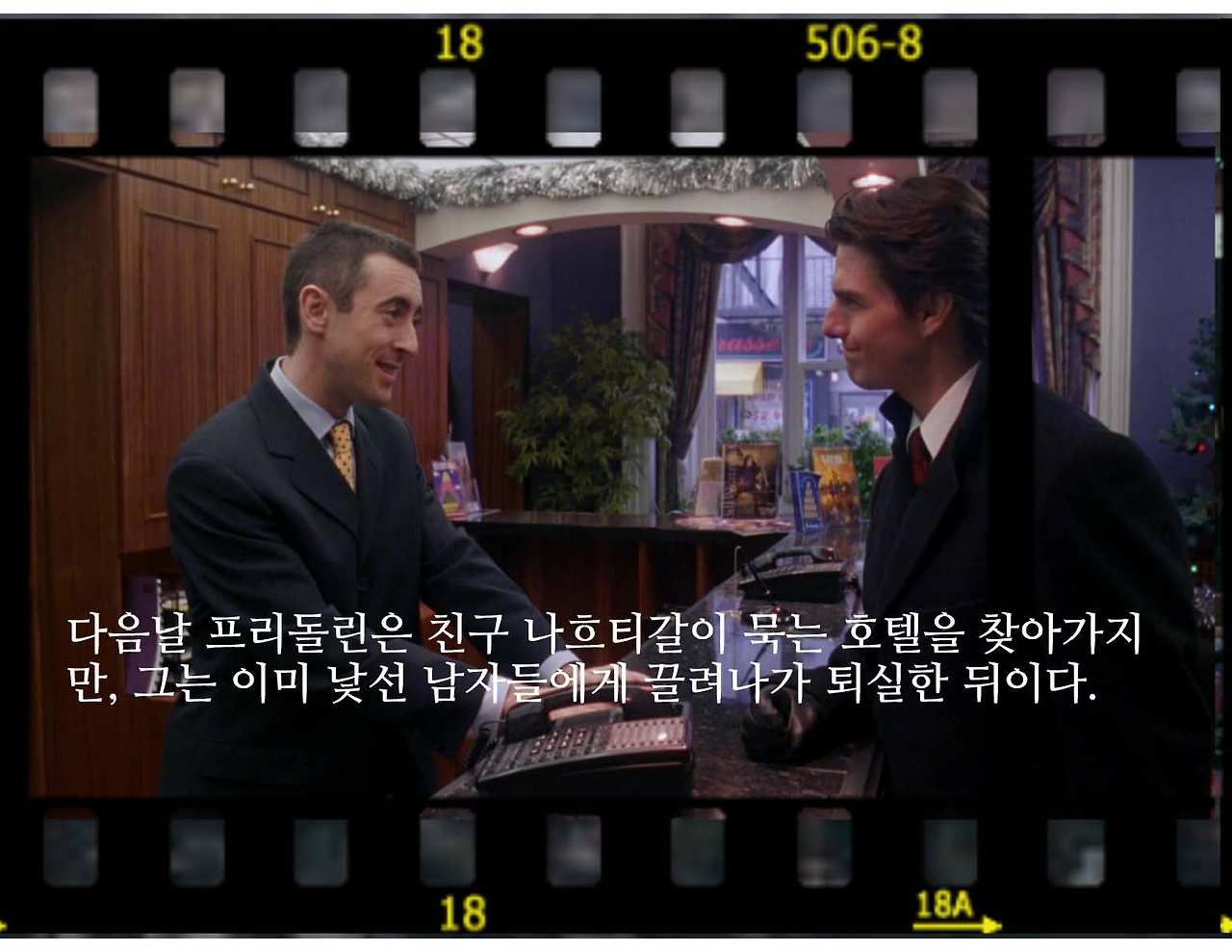 화면에 비친 영화 <블룸 인 러브Blume in Love>는 이혼 전문 변호사 블룸이라는 남자가 전처와 현 애인, 자신의 비서 사이에 갈피를 잡지 못하고 베네치아에서 방황하는 이야기이다. 큐브릭은 이 영화가 주 선율로 쓴 노래 ‘빈, 나의 꿈의 도시’를 <아이즈 와이드 셧>으로 단 1초쯤 가져온 것이다. 아는 사람은 알 것이라는 큐브릭의 선물이다.