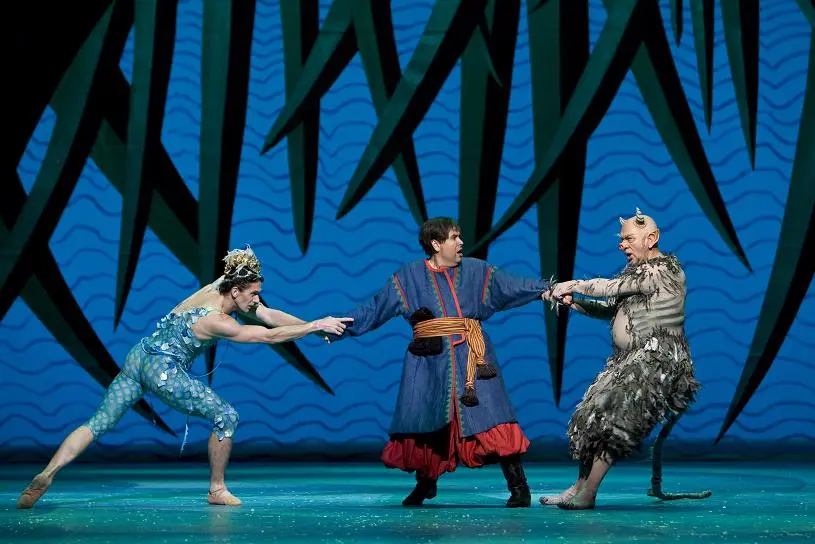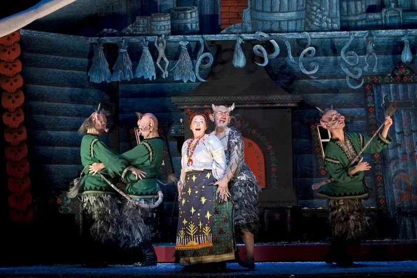 무당 솔로하를 두고 악마와 동네 영감이 차례로 들이대다 숨고 찾는 2막의 설정은 차이콥스키가 존경한 <피가로의 결혼>에도 나온다. 돼지처럼 보이는 악마의 행색은 로열 오페라 관객이라면 브린 터펠이 연기했던 베르디의 팔스타프를 떠오르게 할 것이다. 더욱이 아낙들의 세탁통에 던져진 팔스타프처럼 악마도 자루에 담겨 끌려다닐 신세이다.