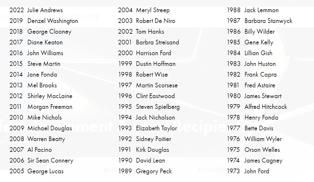 미국 영화 연구소(American Film Institute)는 해마다 그해의 가장 주목할 만한 영화 열 편과 더불어 평생 공로상(AFI Life Achievement Award)을 시상한다. 미국 영화의 업적을 상징하는 수상자의 면면은 아래와 같다.