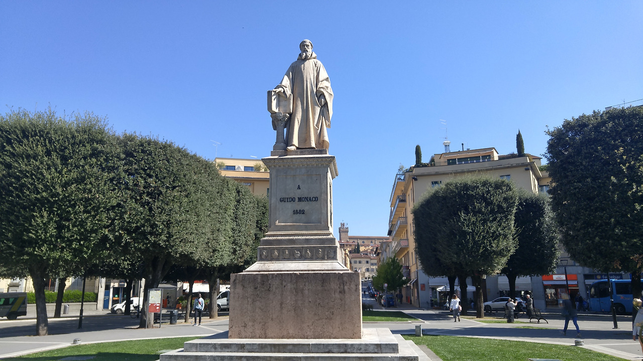 역 앞 광장부터 아레초의 첫 주인공이 반긴다. 아레초의 귀도(Guido d’Arezzo, 992-1050)는 우리가 아는 계명창을 고안한 사람이다. 성 요한 찬가의 가사 중 머리글자를 따서 ‘우트(도)레미파솔라(시)’라는 음이름을 붙였다. 만든 원리를 상술한 명판에서 서양음악의 초석을 놓은 아레초의 자부심을 읽을 수 있다. 많은 사람이 아레초에 오는 이유는 로베르토 베니니의 영화 <인생은 아름다워>에서 받은 인상 때문이다. 때 묻지 않은 주인공 귀도(왜 이름이 ‘귀도’인지는 자명하다)가 사랑하는 ‘공주’ 아내를 얻고, 알토란 같은 아들과 노닐던 시내를 떠올리는 글이 인터넷에 숱하다.