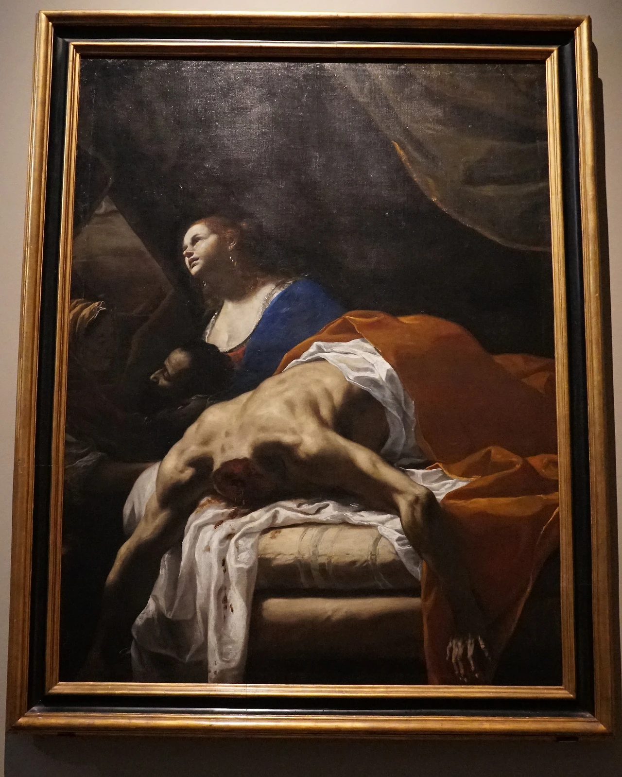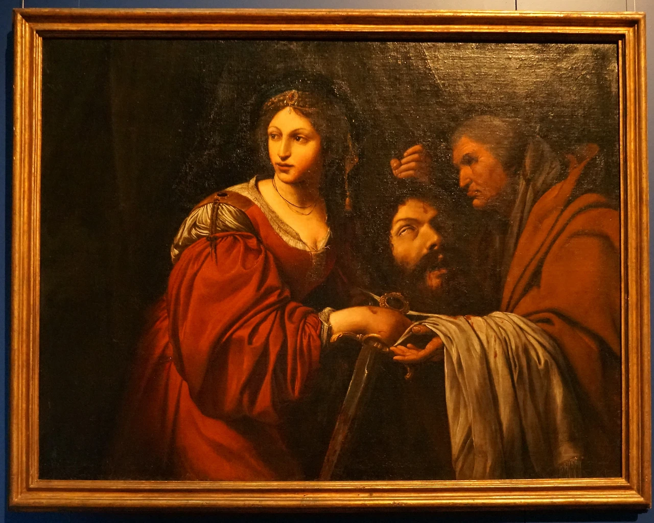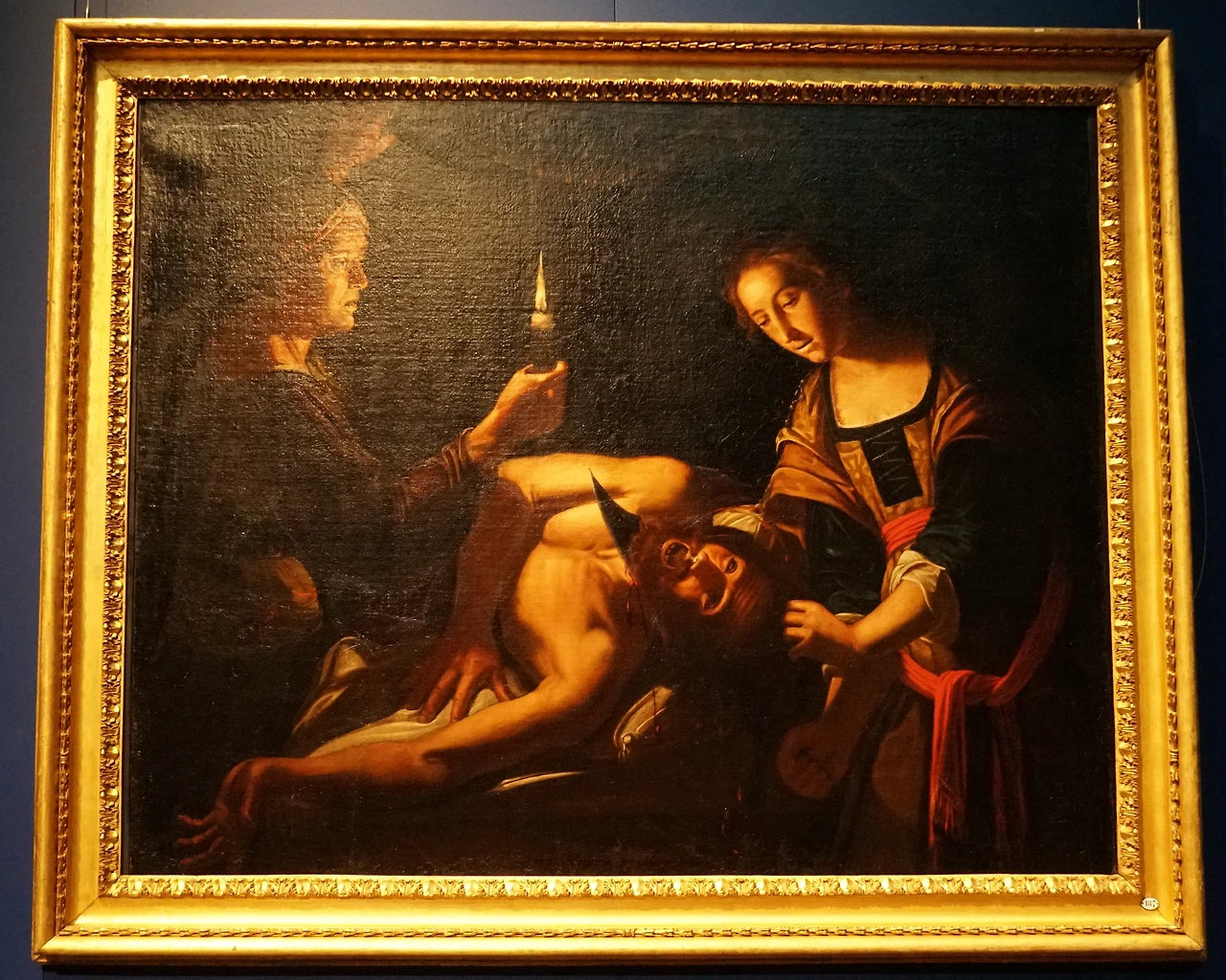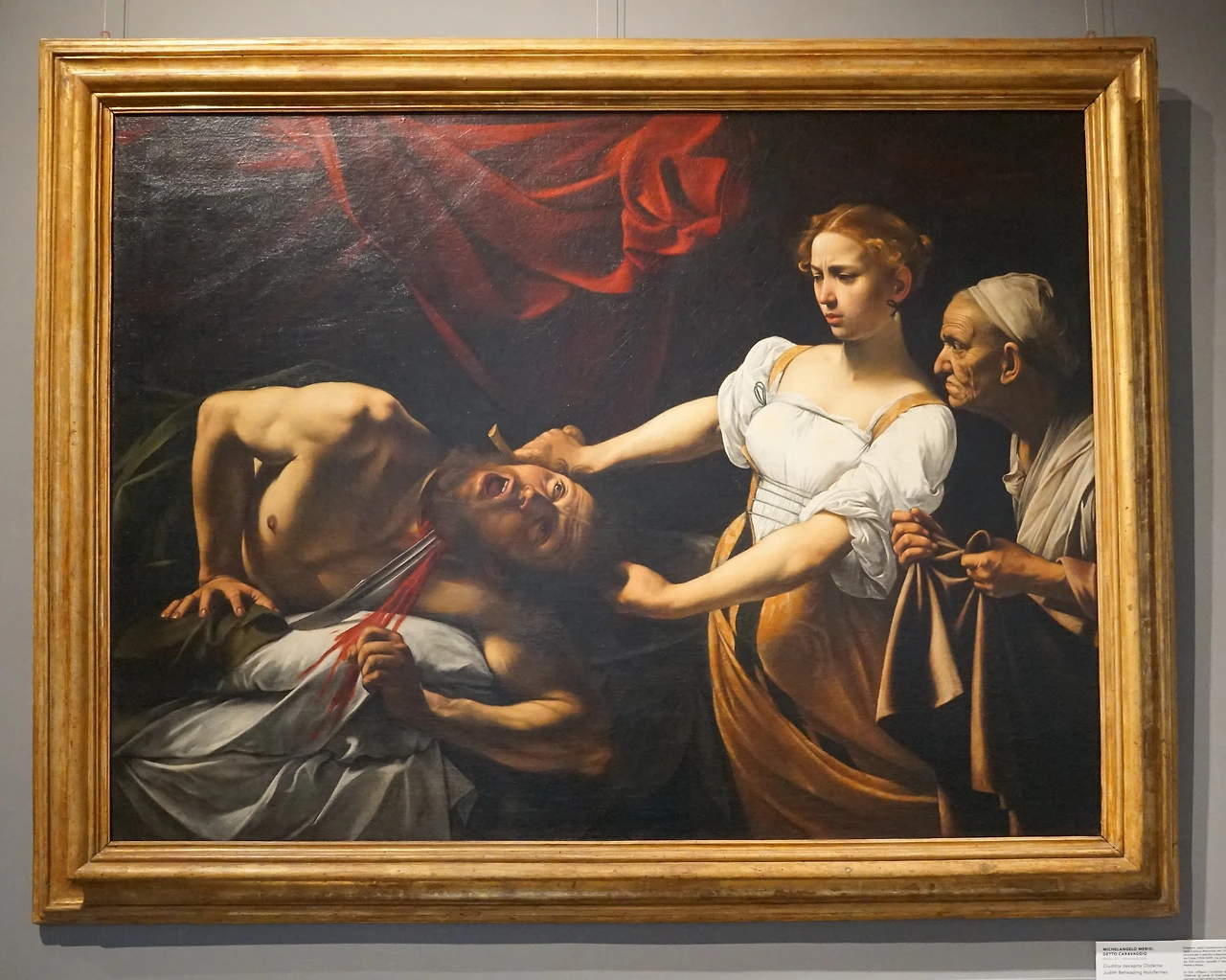 두 눈이 공포에 사로잡혀 가차없는 유딧을 바라보는 가운데 목에서 피가 솟구친다. 유모는 천막 안으로 들어와 목이 떨어질세라 자루에 담을 기세이다. 바르베리니 궁전의 대표작 가운데 하나이다. 폭력적이고 선명한 카라바조의 그림은 종교개혁의 역풍을 맞은 로마 가톨릭이 취한 결연한 태도가 엿보인다. 카라바조의 영향력은 오랜 시기, 폭넓은 지역에서 파장을 일으켰다.