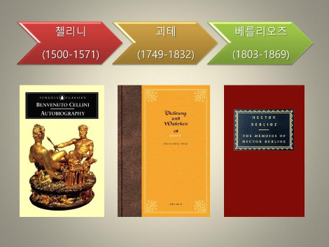 시점이 중요하다. 괴테가 <이탈리아 기행>을 낸 것이 1816-17년이니 오히려 첼리니 번역이 앞선 것이다. 괴테가 쓴 또 하나의 자서전 <내 생애에 대해: 시와 진실Aus meinem Leben: Dichtung und Wahrheit>도 1811년부터 사후인 1833년까지 4부로 나뉘어 발간되었다. <이탈리아 기행>과 <시와 진실> 모두 첼리니의 “40대 자서전론”에 영향을 받아 썼음을 짐작할 수 있다.