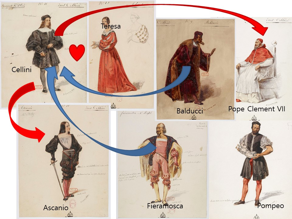 존경하던 괴테의 영향으로 첼리니를 알게 된 프랑스 작곡가 엑토르 베를리오즈는 그의 연애담과 <페르세우스 상> 제작 과정을 엮어 얘기를 만들었다. 생상스만큼은 아니더라도 베를리오즈의 첫 오페라도 철저한 홀대를 받았다. 이는 매우 부당하다. 굳이 사실에 얽매이지 않고 첼리니 생애의 여러 단편을 하나로 엮어낸 대본도 짜임새가 있고, 베를리오즈 특유의 화려한 음악도 매력적이기 때문이다.