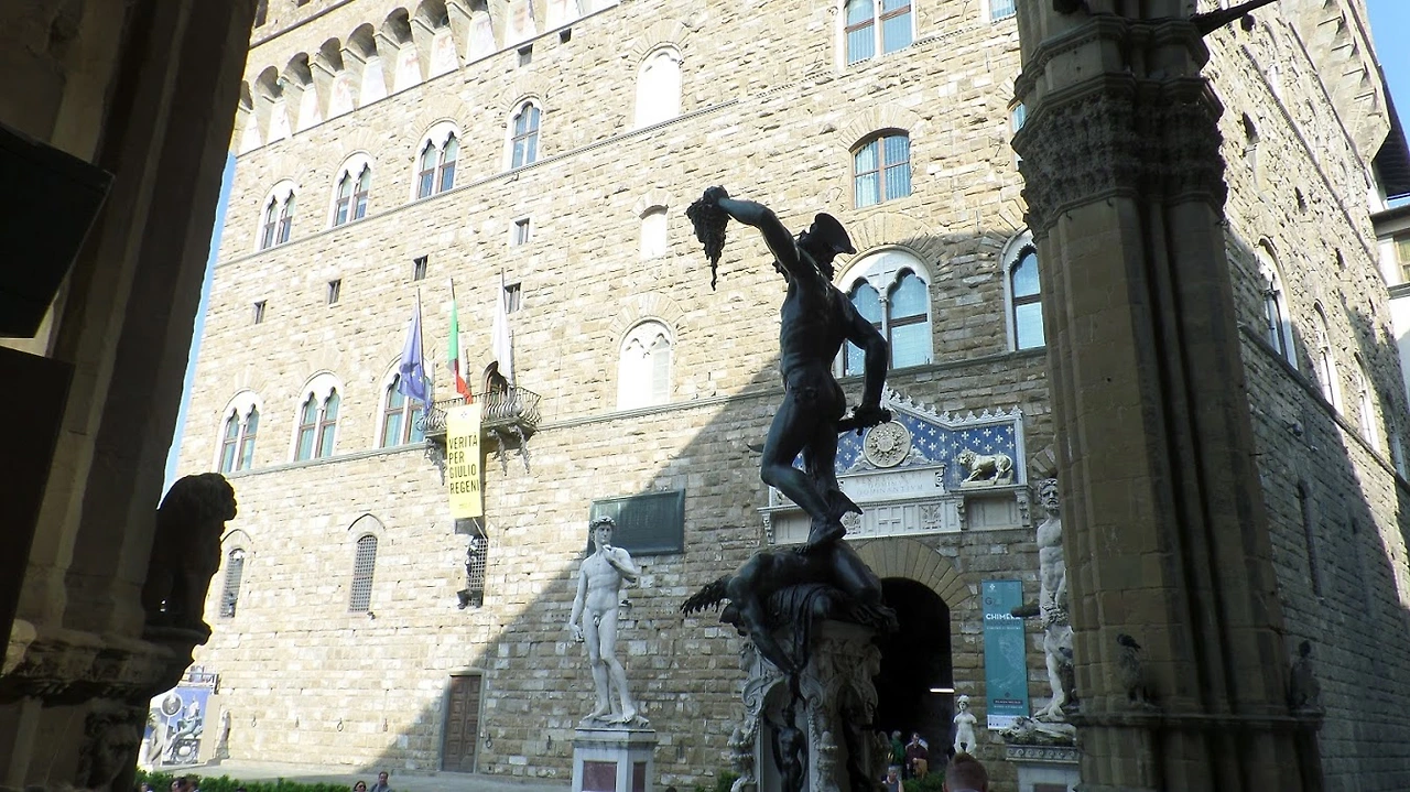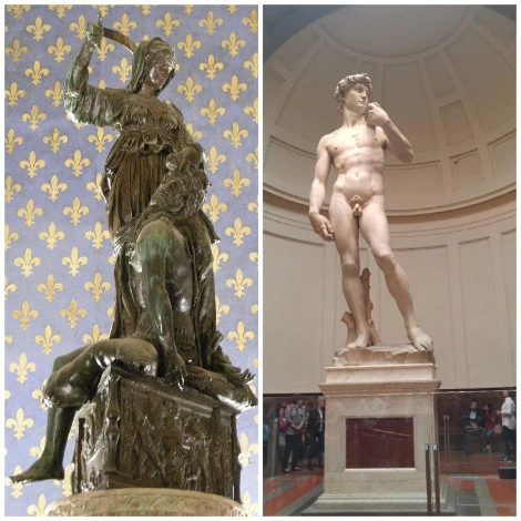 베키오 궁전 앞에 서 있는 미켈란젤로의 <다윗>은 모조품이다. 옥외에서 상하는 것을 막기 위해 아카데미아로 옮긴 뒤에 그 자리에 카피를 세웠다. 그런데 첼리니의 <페르세우스> 뒤편에서 보면 미켈란젤로의 <다윗>이 페르세우스가 치켜든 메두사의 머리를 보고 돌이 된 것이 아닌가 싶은 생각이 든다. 그렇지 않더라도 부러움과 질투의 눈으로 페르세우스를 보고 있는 듯한 인상을 준다. 그래서 진품을 옮긴 것인가?