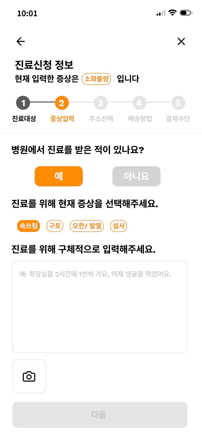 > 주요 증상에 맞는 증상들을 미리 텍스트 형태로 제시해주고 해당되는 증상에 체크하는 방식이 어떨까?