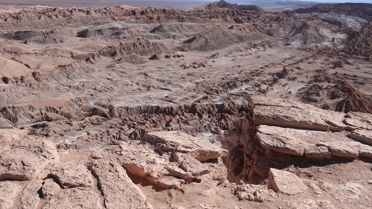 마을을 벗어나는 듯하더니 금새 첫 번째 목적지. '달의 계속'이 파노라마처럼 내려다보이는 장소다. 가이드는 일행을 스페인어 그룹과 영어 그룹으로 나눈다. 먼저 스페인어로 설명하고, 이어서 영어로 설명한다. 벌써 몇 달째 스페인어를 귀에 달고 다니다 보니, 느낌상으론 스페인어가 편하다. 녹색이라곤 흔적도 찾아볼 수 없다. 온 세상이 흙빛이다. 군데군데 눈에 띄는 흰색은 나중에 알고 보니 소금 결정체다. 가이드말로는 이곳에서 찍은 사진과 달에서 찍은 사진을 함께 보여주며, 진짜 달 사진을 찾아내라고 하면, 십중팔구 정확히 집어내기 어렵다고 한다. 그럴 수 있겠다는 생각이 들면서도, 암스트롱 달착륙 사진 말고는 딱히 기억나는 달 사진이 없다.