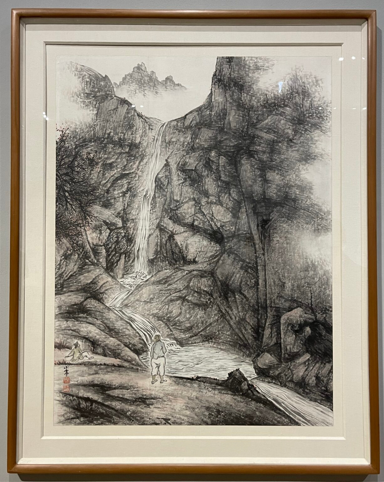 <금강산 구룡폭>은 금강(金剛)의 세례를 높은 곳에서부터 낮은 곳으로 하강하는 형태로 담았다. 그 세례에 흠뻑 젖어 경이롭게 올려보는 두 사람과 더불어 하늘과 인간이 수직으로 만난다. 폭포를 통해 나직한 인간과 높직한 산이 마주하는 것은 만남이 누구로부터 비롯되는지 이르는 듯하다. 하늘과 인간이 잇닿는 것은 은총(恩寵)으로부터 비롯된다고 말이다. 한 획씩 적묵법으로 깊게 새긴 나무와 바위는 힘 있게 내리는 폭포로 인해 세계에 가닿는 은총을 보여준다. 그렇게 변관식 작가는 자신의 호를 딴 소정(小亭) 양식으로 드넓은 은총을 그려내어 하늘을 예배한다.
